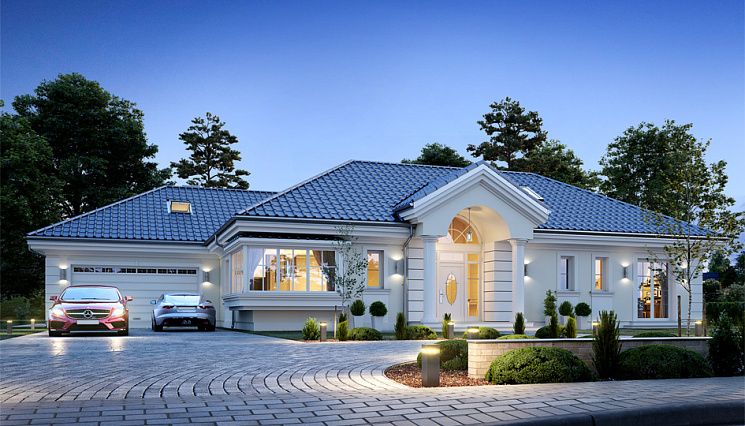 Проект комфортного одноэтажного дома с мансардой, камином и гаражом на два автомобиля S8-315-2 (Парковая Вилла 6)