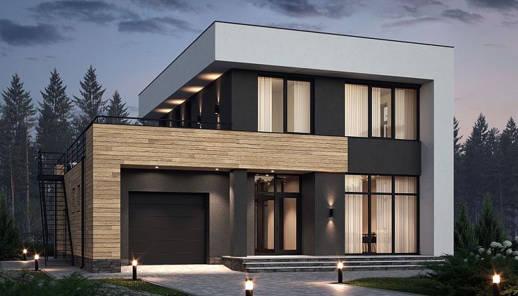 Двухэтажный дом с плоской эксплуатируемой кровлей и встроенным гаражом S7-187 (3-50)