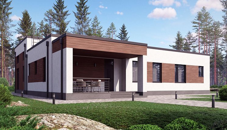 Проект просторного одноэтажного дома из ж/б панелей с плоской кровлей SP-106