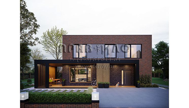Проект двухэтажного дома с облицовкой кирпичом в стиле Райт S-250