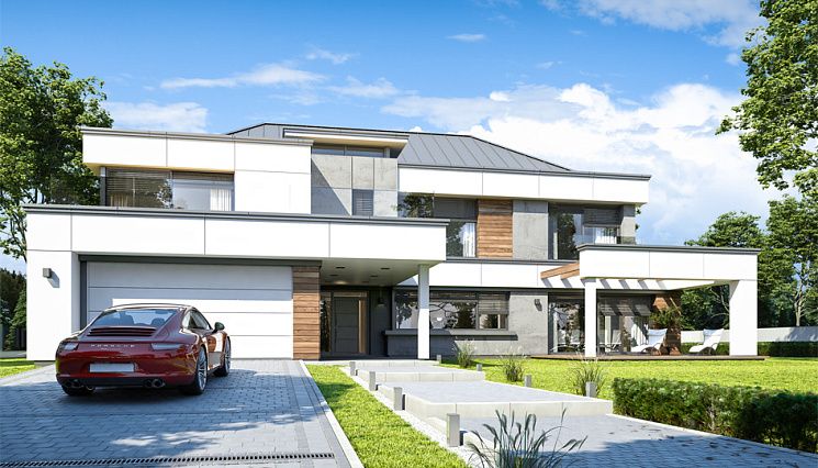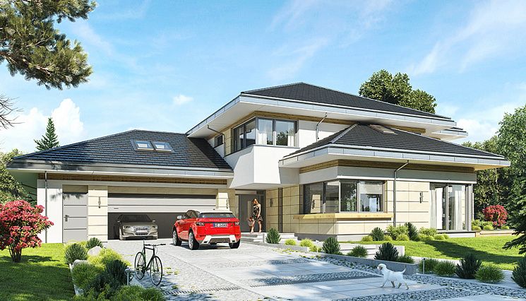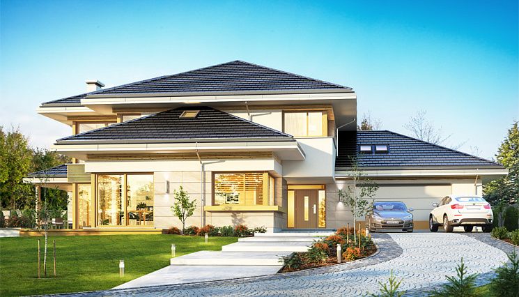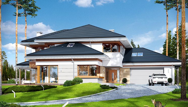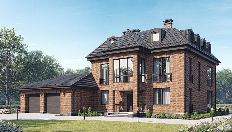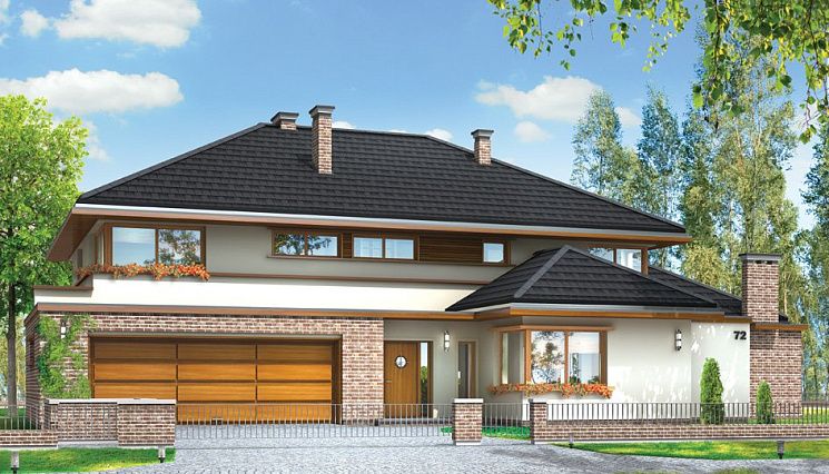 При строительстве дома от 400 кв.м под ключ нередко возникают трудности, обусловленные характеристиками земельного участка: подобрать ровную площадку под здание таких размеров нелегко. Кроме сложностей рельефа (перепады, уклон), большое значение имеет близость грунтовых вод. Специалисты нашей компании с блеском справляются с самыми сложными проблемами, находя для них оригинальные и эстетически безупречные решения. От условий строительства, архитектурного замысла и пожеланий заказчика зависит и выбор материала: кирпич, пено- или газобетонные блоки, керамические блоки, дерево. При необходимости в типовой проект могут быть внесены изменения, касающиеся внутренней планировки, размеров и материалов оконных и дверных блоков, наличия гаража или навеса для автомобилей и его площади (на одну или две машины). Для крыши можно выбрать черепицу разных видов — металлическую, керамическую или гибкую — и разных цветов. При этом необходимо учитывать особенности климата в данной местности, условия эксплуатации здания и свойства кровельного материала.