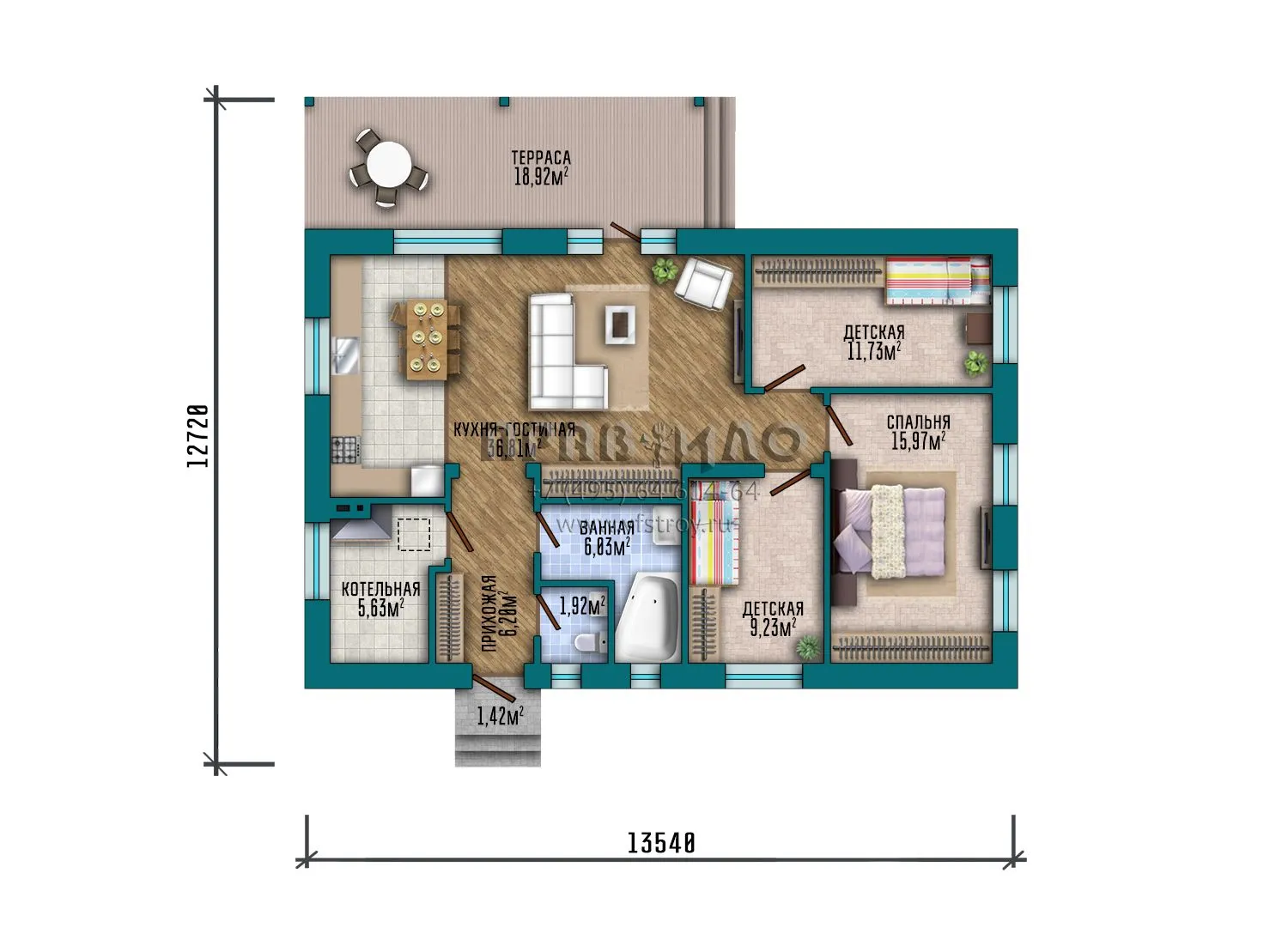Проект небольшого одноэтажного дома с тремя спальнями S2-114 (383-114-1)