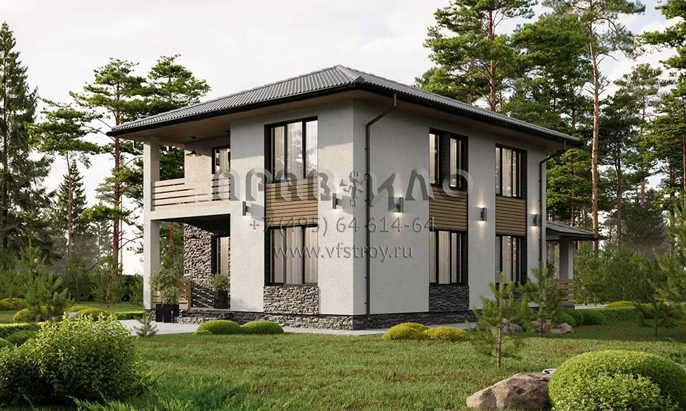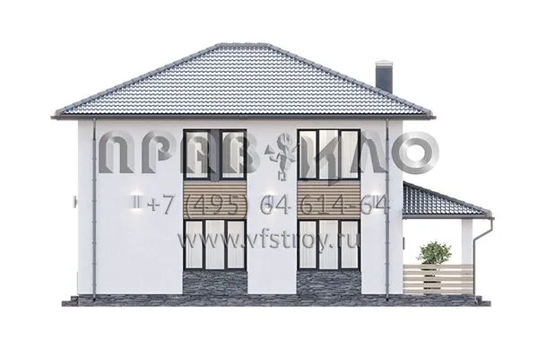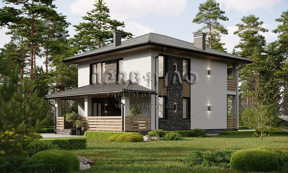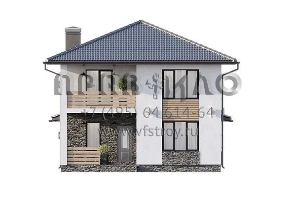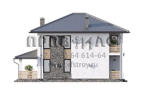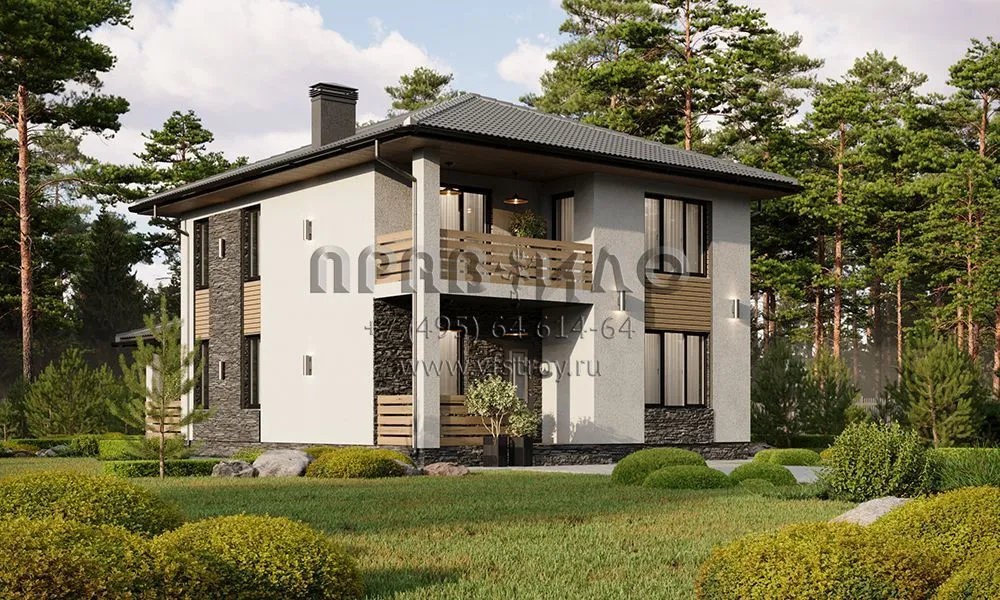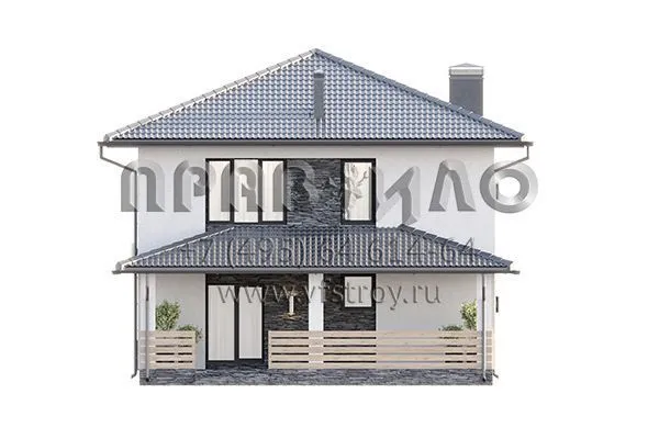 Проект двухэтажного дома с комбинированной отделкой фасада декоративной штукатуркой, камнем и планкеном S2-161 (380-161-2)