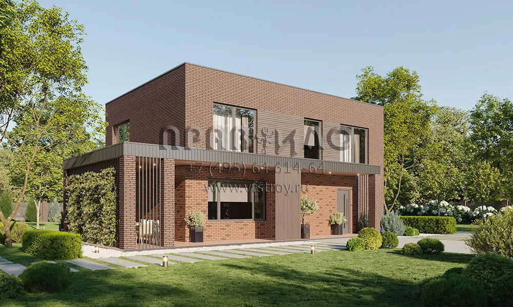 Проект дома из газобетона в стиле хай-тек с просторной совмещенной зоной кухни-столовой и гостиной, большой террасой и тремя спальнями на втором этаже S2-195 (147-195-2)