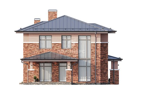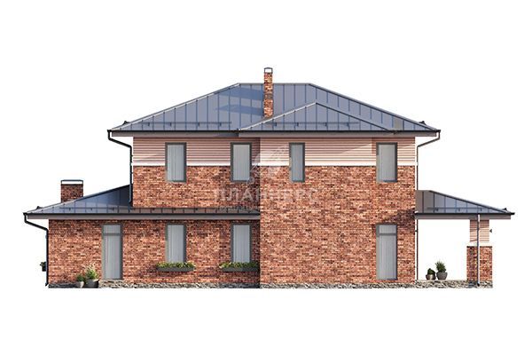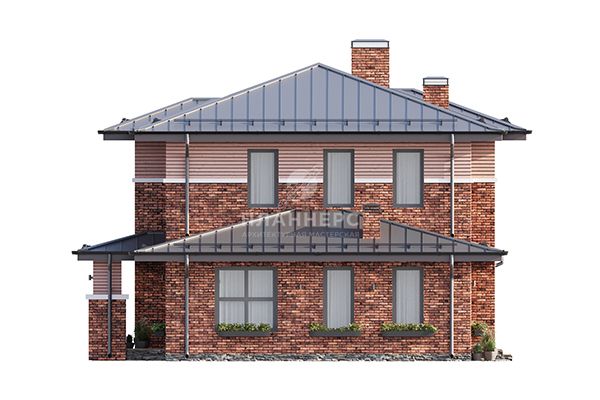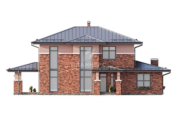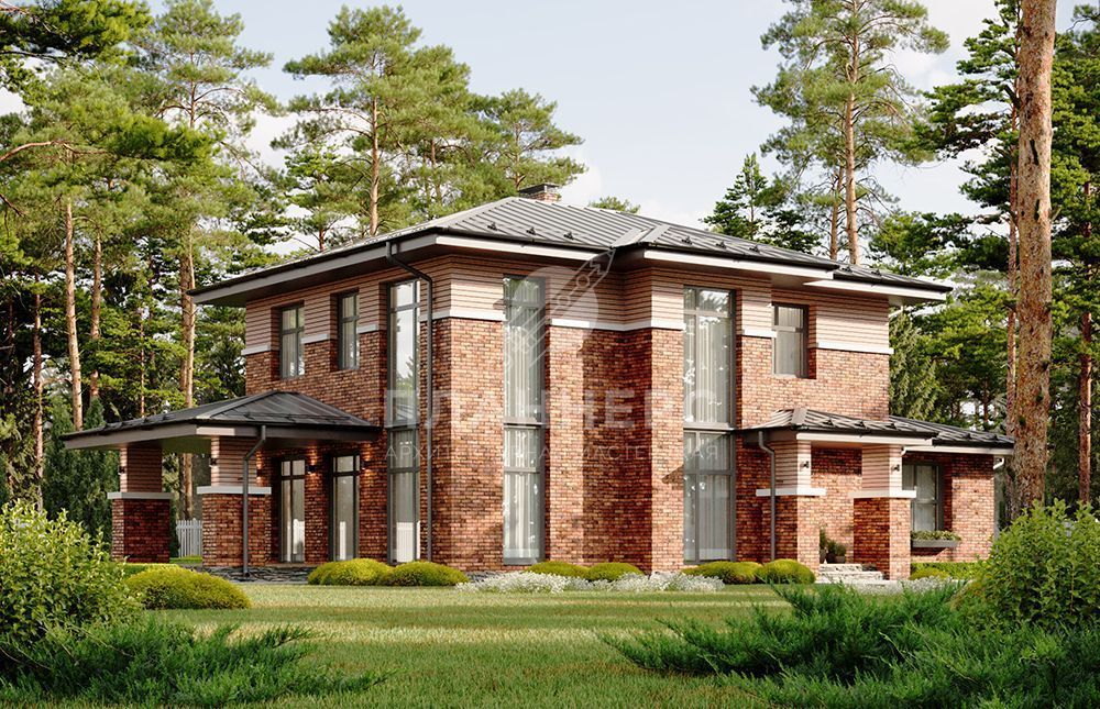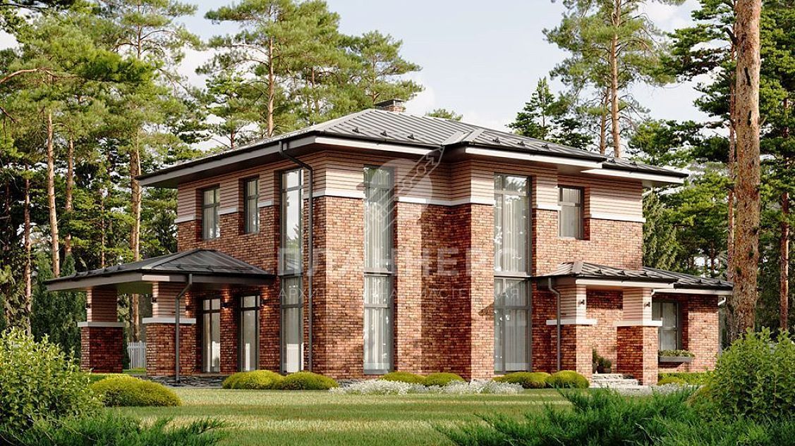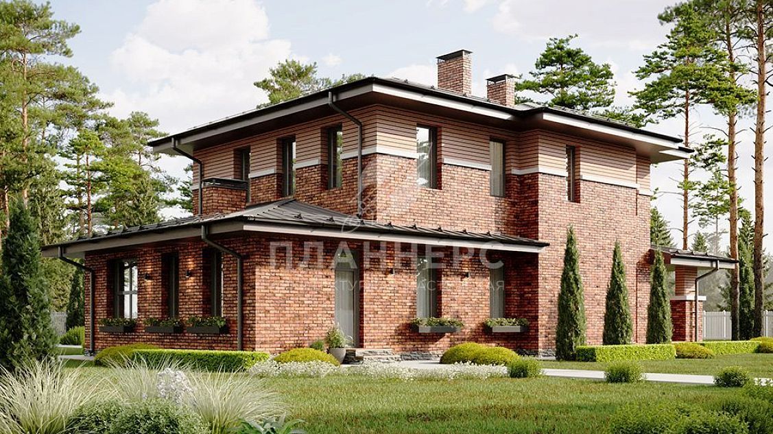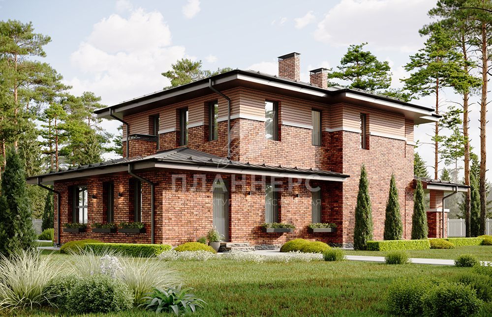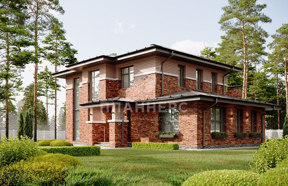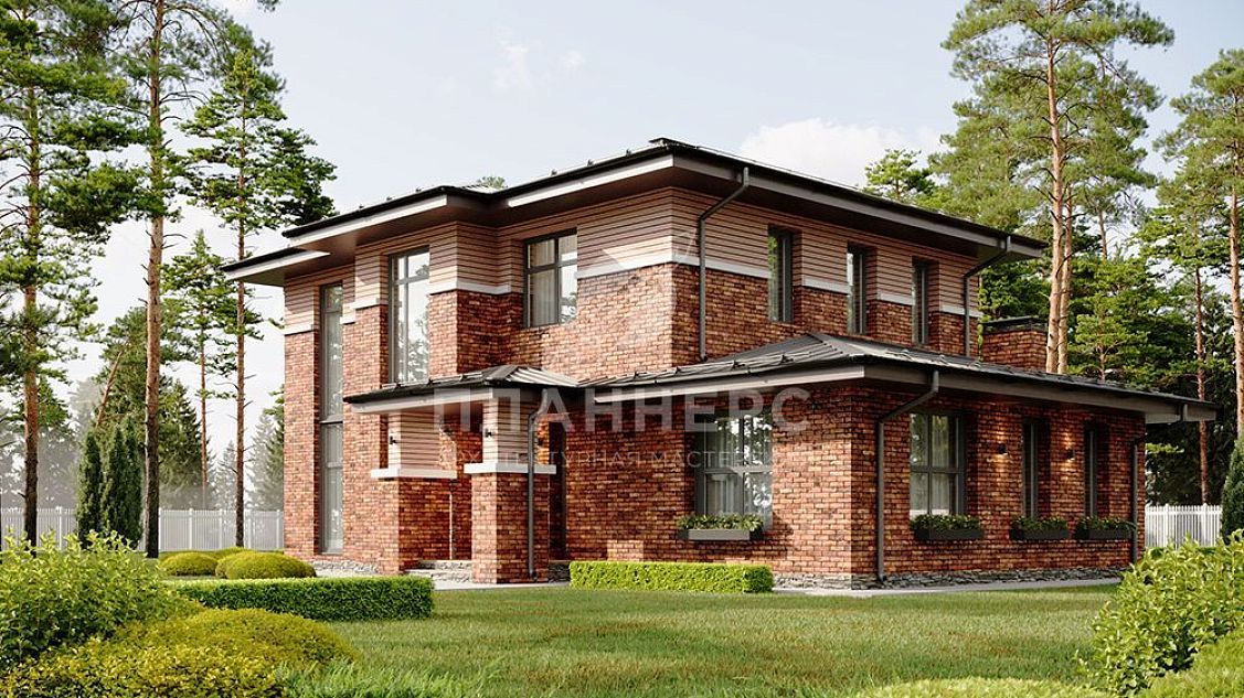 Проект двухэтажного дома в стиле Райта с крытой террасой, многоскатной крышей и комбинированным фасадом из кирпича и планкена S2-201 (447-202-2)