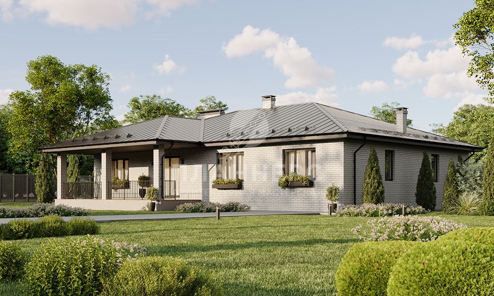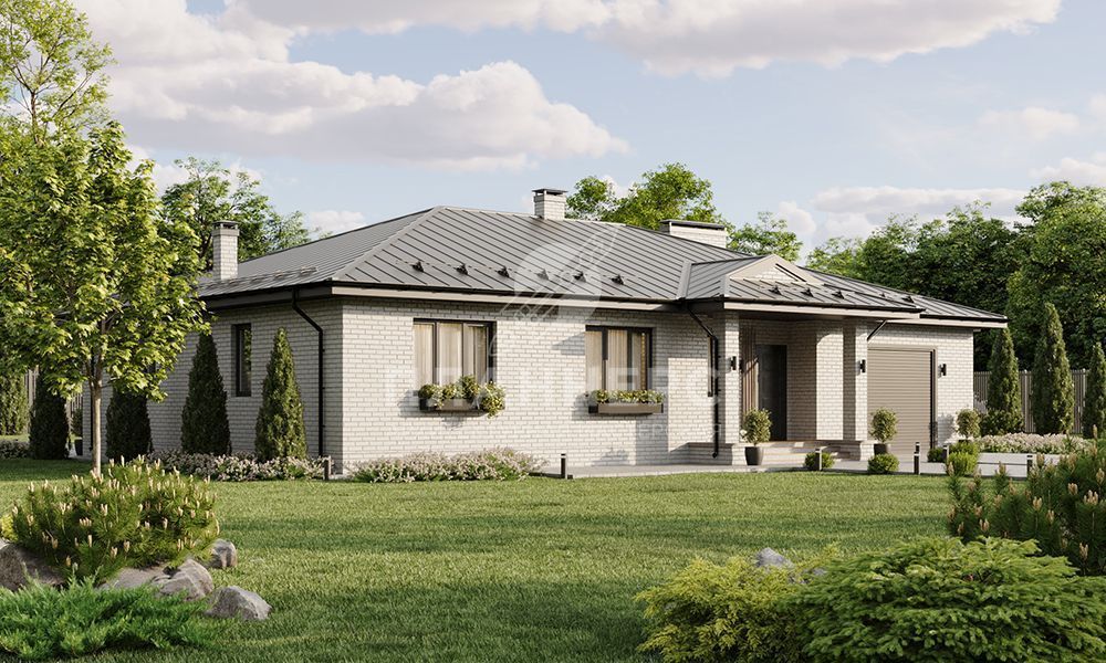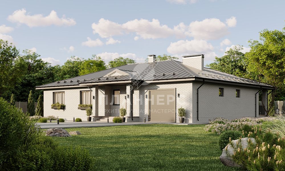 Проект просторного одноэтажного дома с гаражом и большой террасой под общей кровлей S2-214 (441-214-1Г)