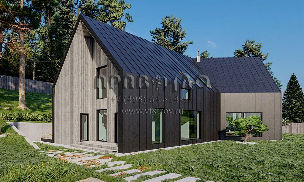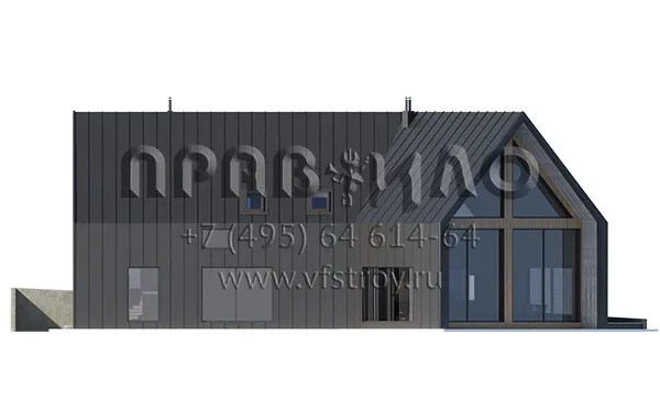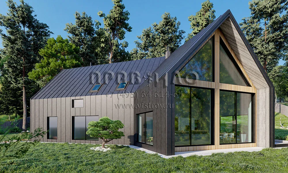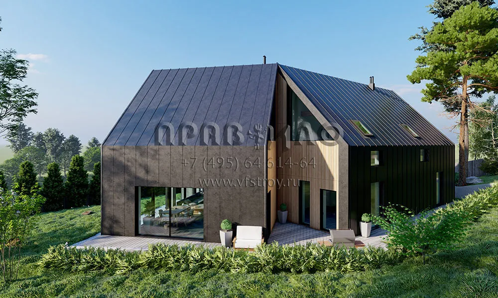 Проект оригинального дома в стиле Барнхаус с большими витражными окнами и вторым светом S2-234 (117-234-1М)