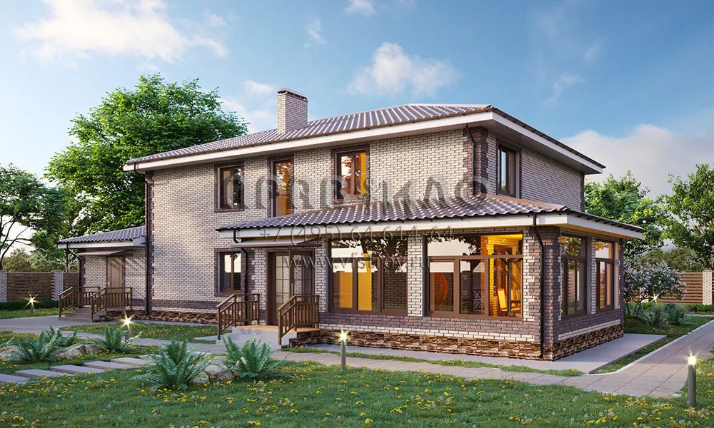 Проект двухэтажного классического дома с большой верандой и гаражом на 2 автомобиля S2-273 (056-273-2Г)
