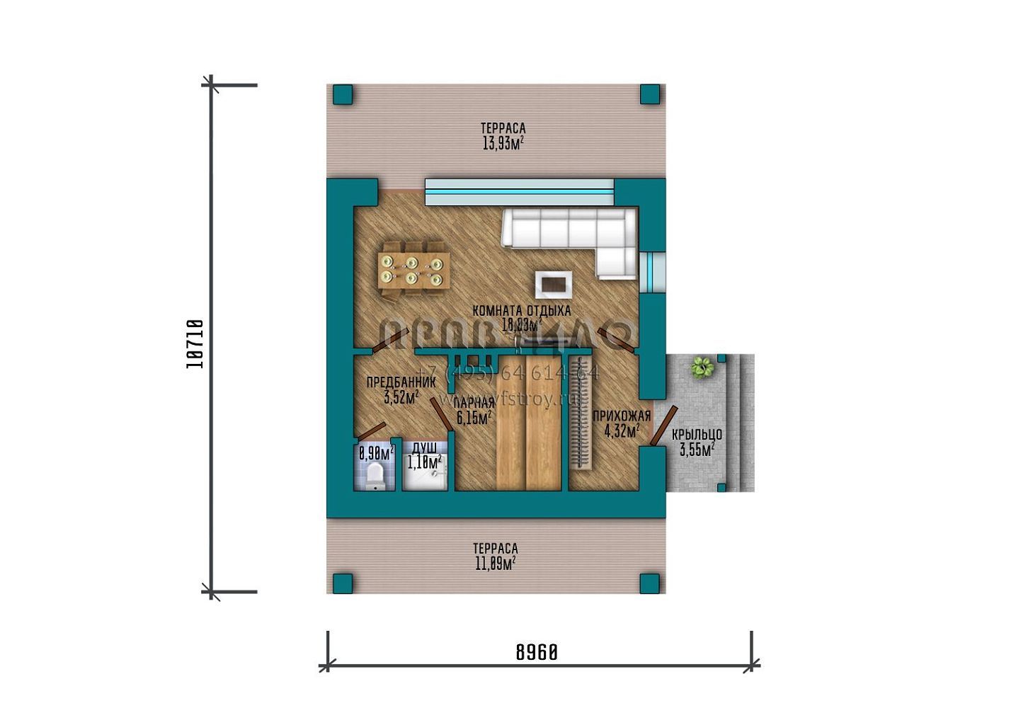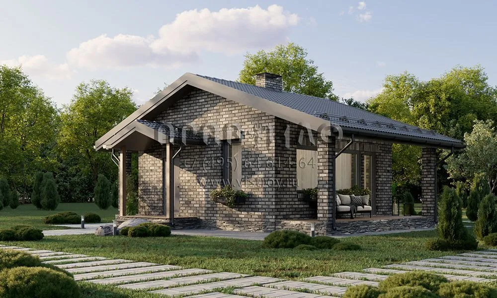 Проект компактной одноэтажной бани в классическом стиле с большой террасой S2-48 (350-48-1)