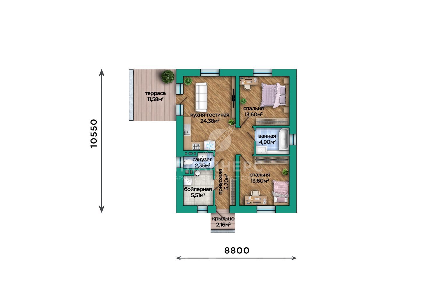 Проект одноэтажного дома с двумя спальнями и двухскатной крышей S2-70 (180-70-1)
