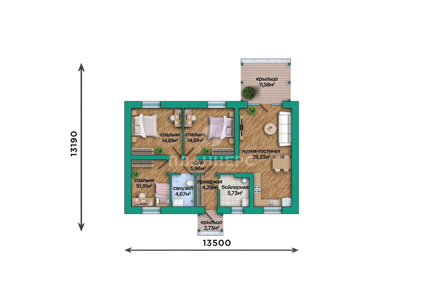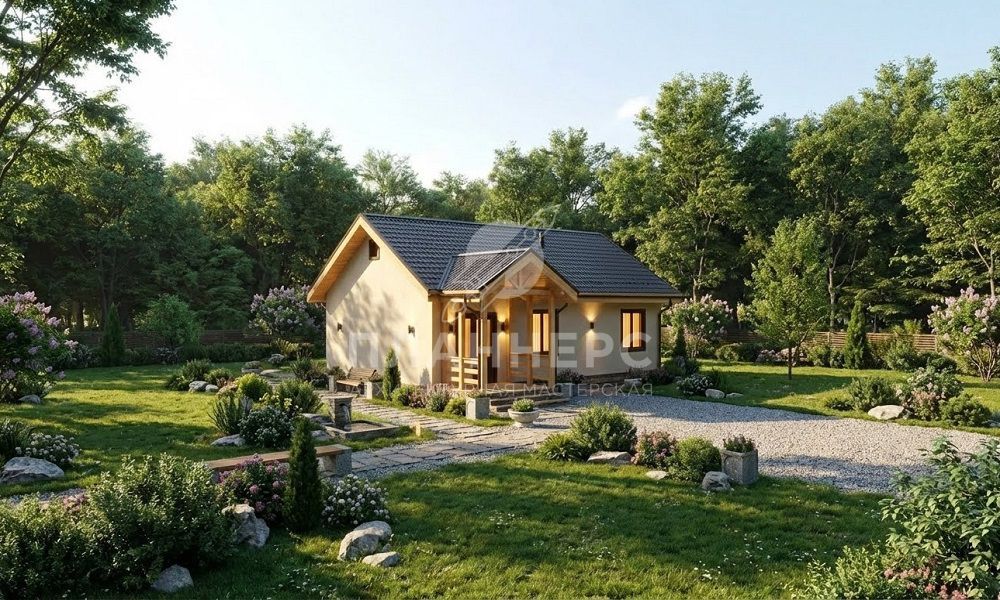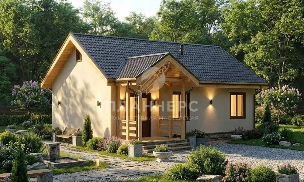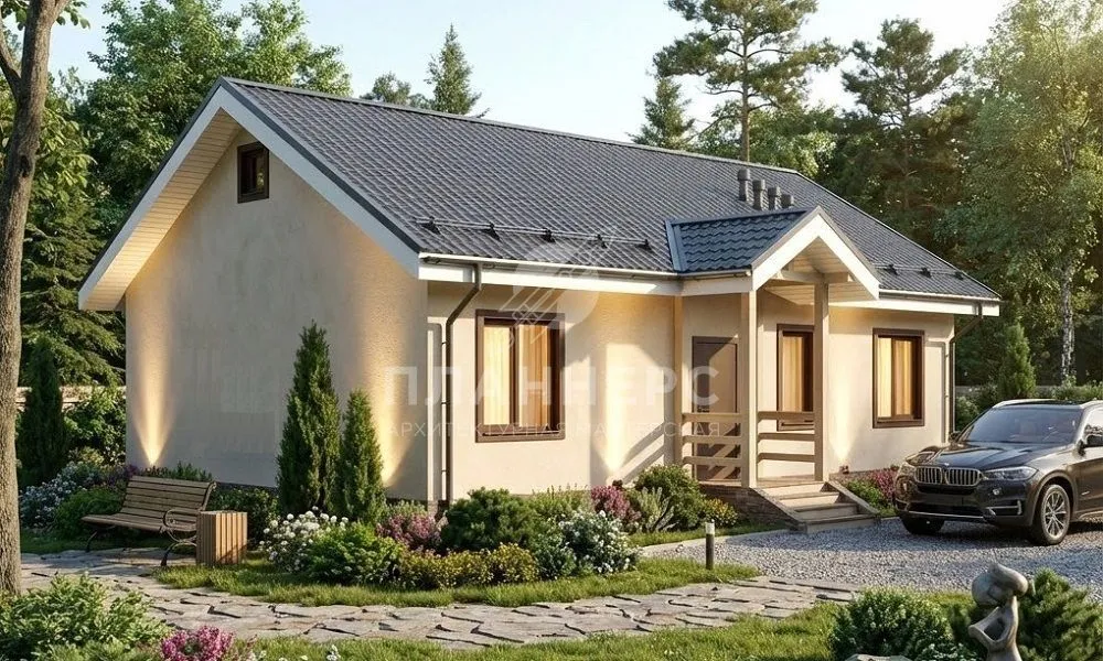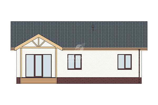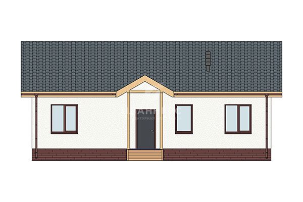 Проект одноэтажного дома 90 квадратных метров из газобетона с террасой и оштукатуренным фасадом S2-90 (461-90-1)