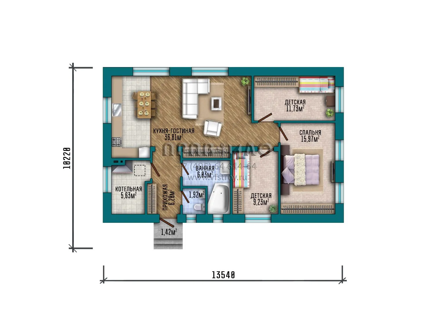 Проект компактного одноэтажного дома с тремя спальнями S2-94 (291-94-1)