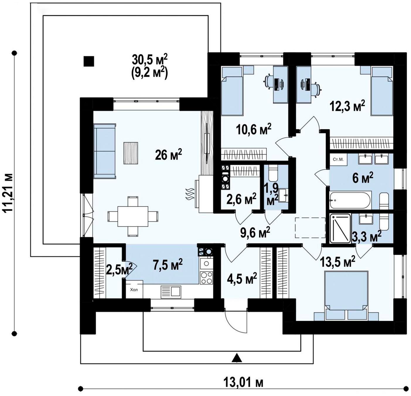 Проект одноэтажного дома небольшой площади со вторым светом над гостиной S3-100 (Z332 D v1)