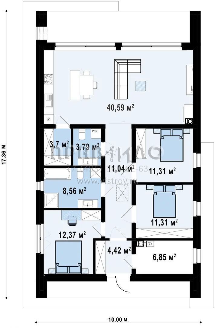 Для проживающих спроектировано три спальные комнаты и две ванные комнаты. Причём одна из них достаточно просторная, чтобы поместить туда и душевую кабину, и ванную.