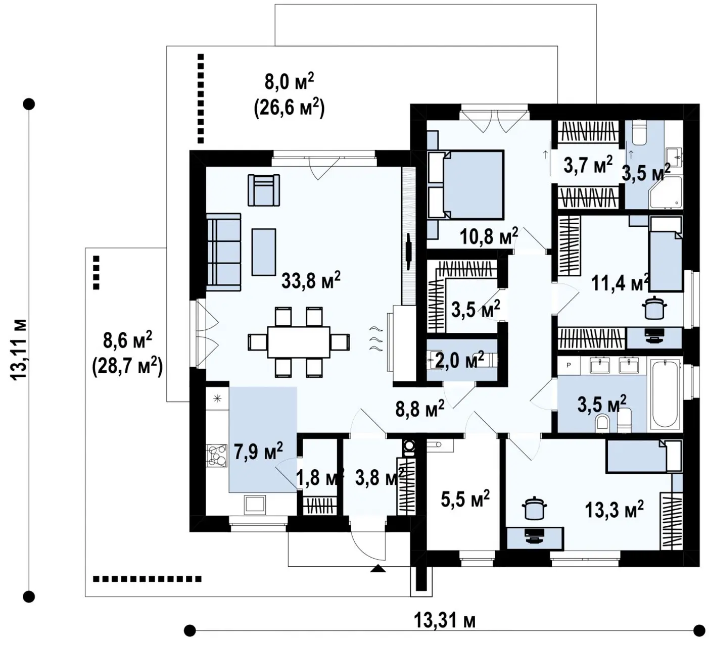 Проект четырехкомнатного одноэтажного дома с летней террасой S3-116-4 (Z462)