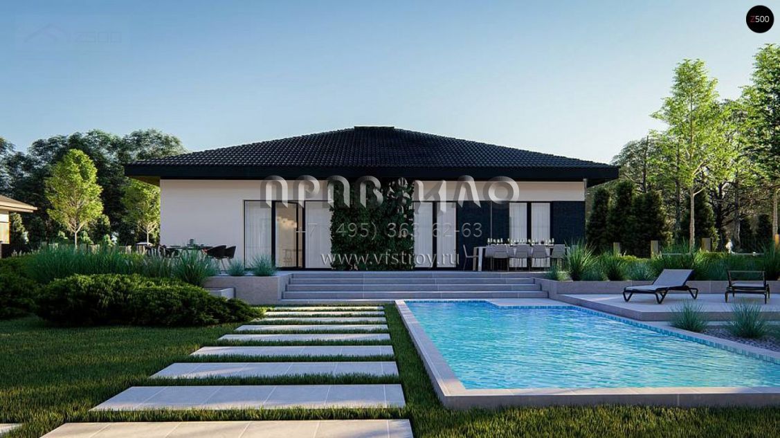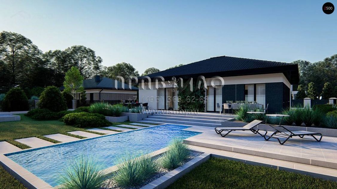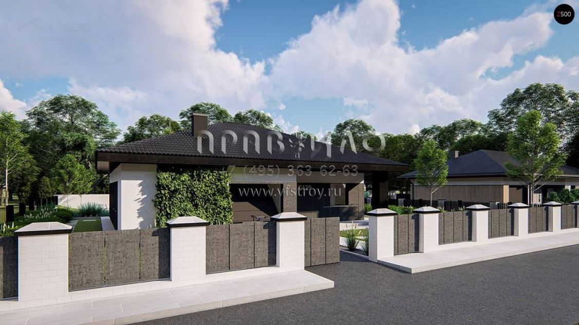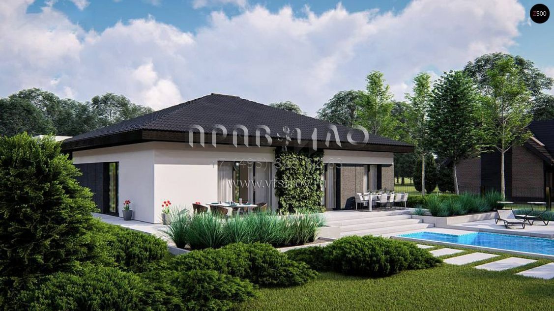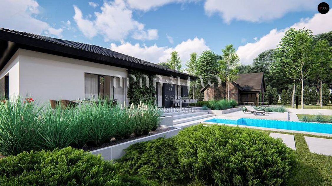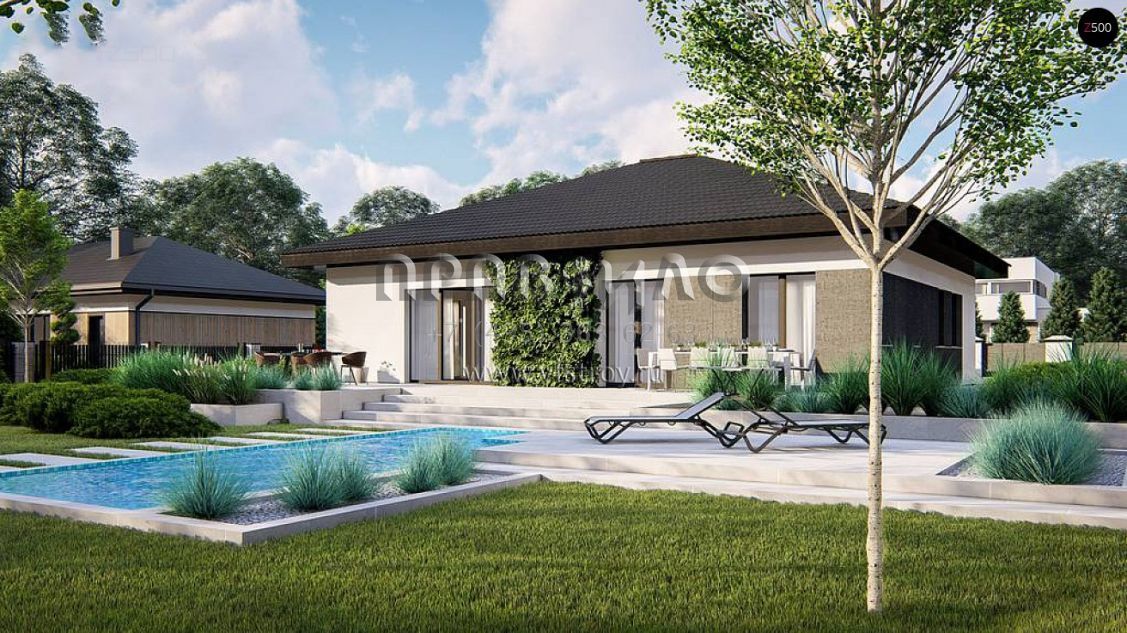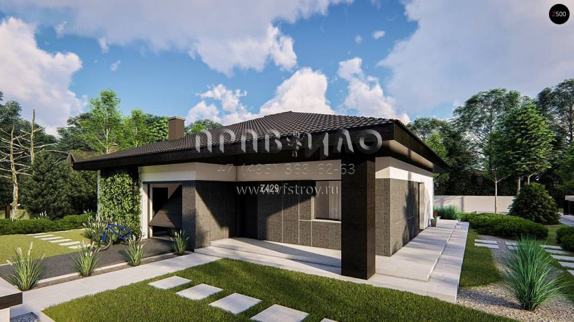 Проект комфортабельного одноэтажного дома с гостиной, двумя спальнями, гаражом и просторной террасой S3-127-7 (Z429)