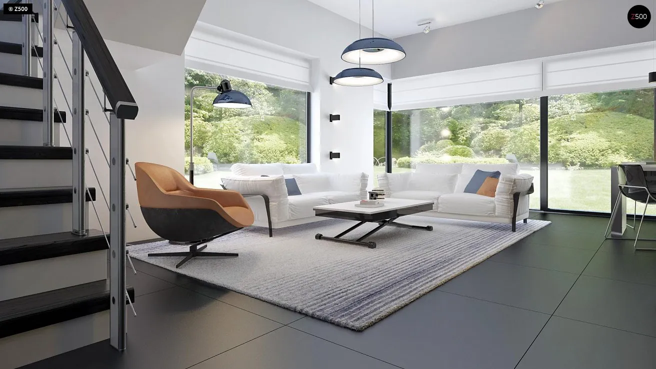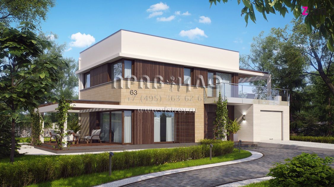 Проект двухэтажного коттеджа с гаражом и террасами на первом и втором уровне S3-131-1 (Zx63 A)