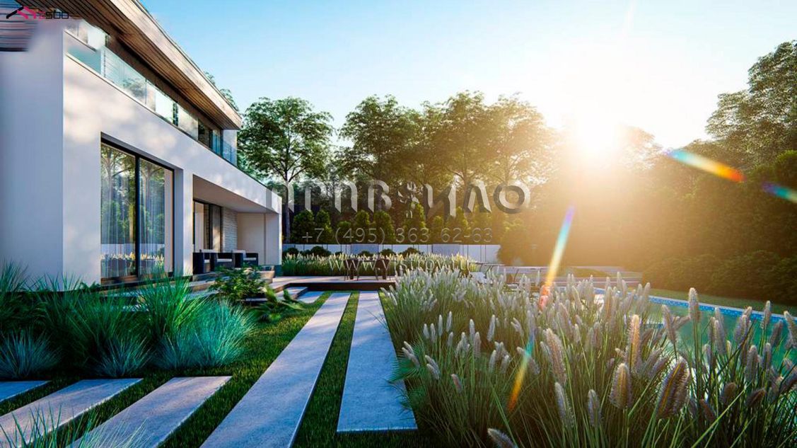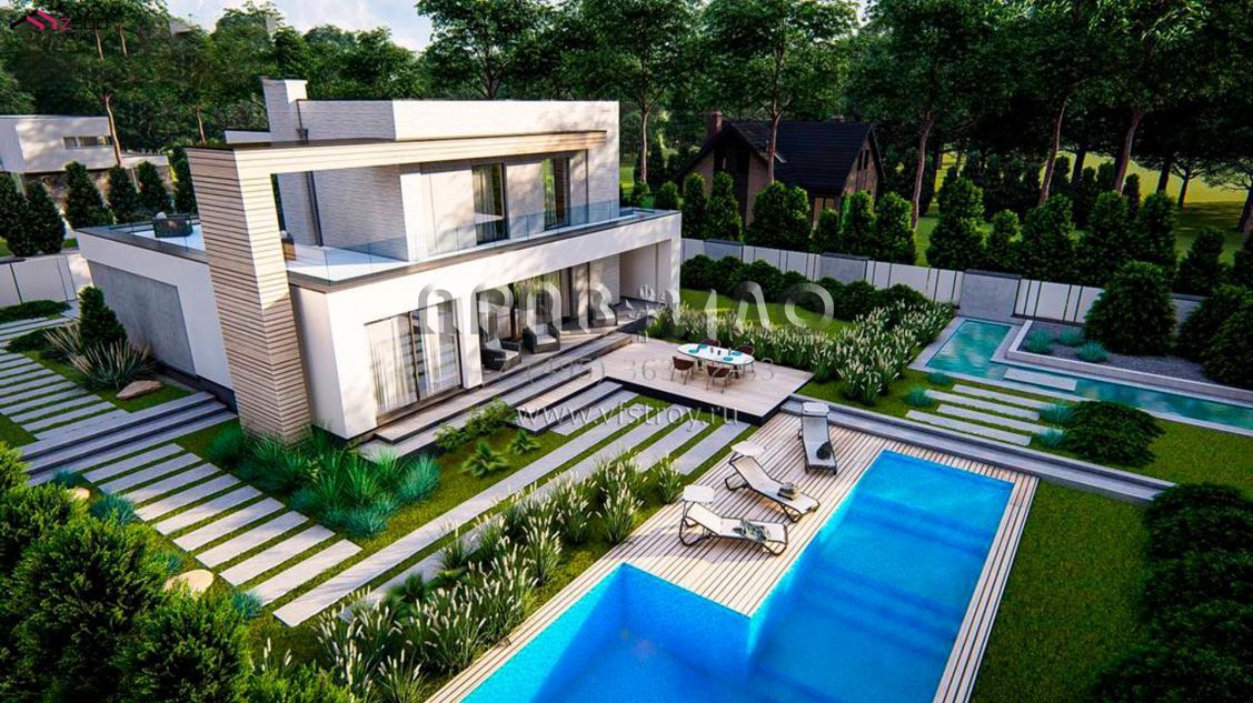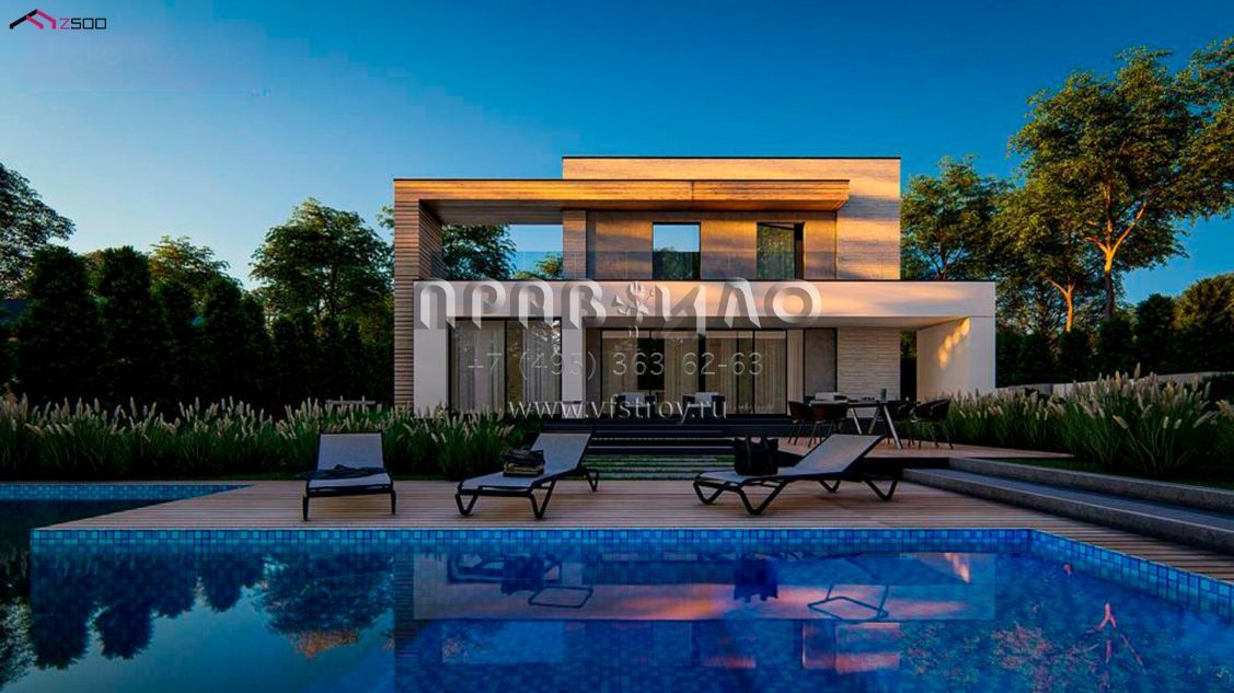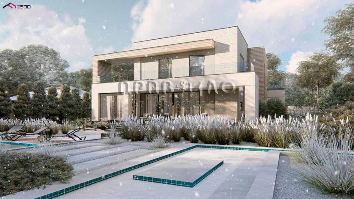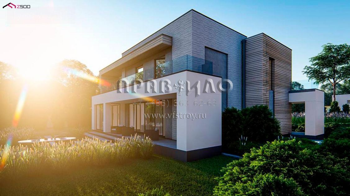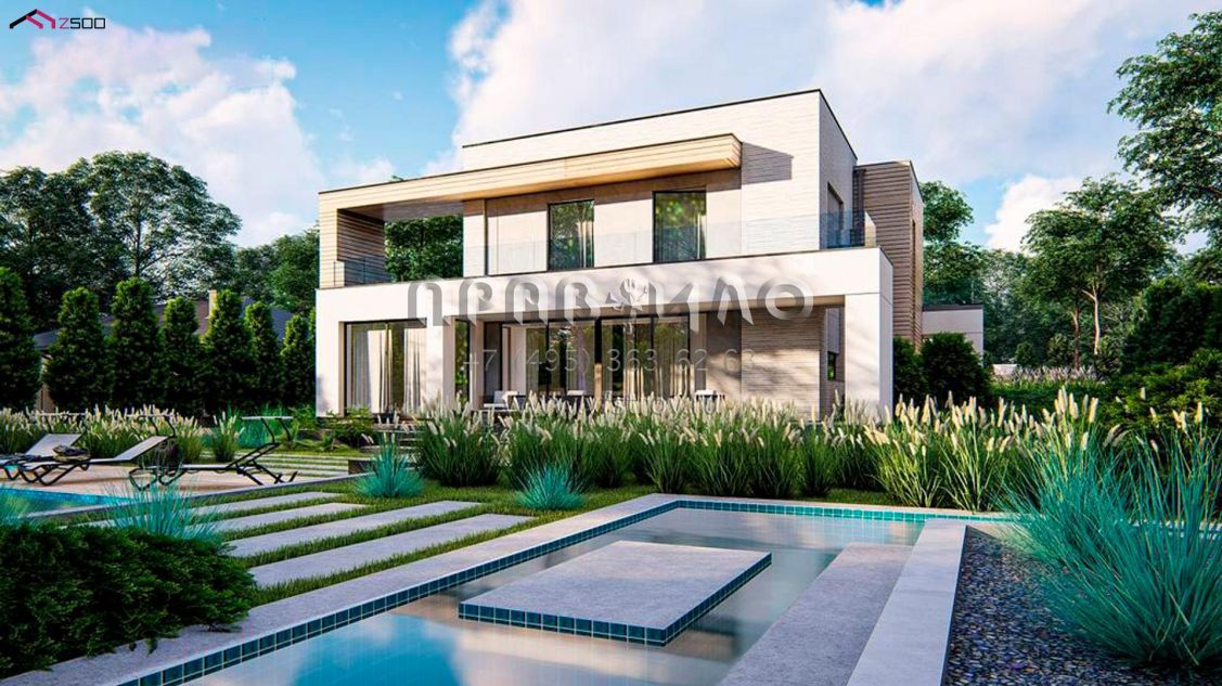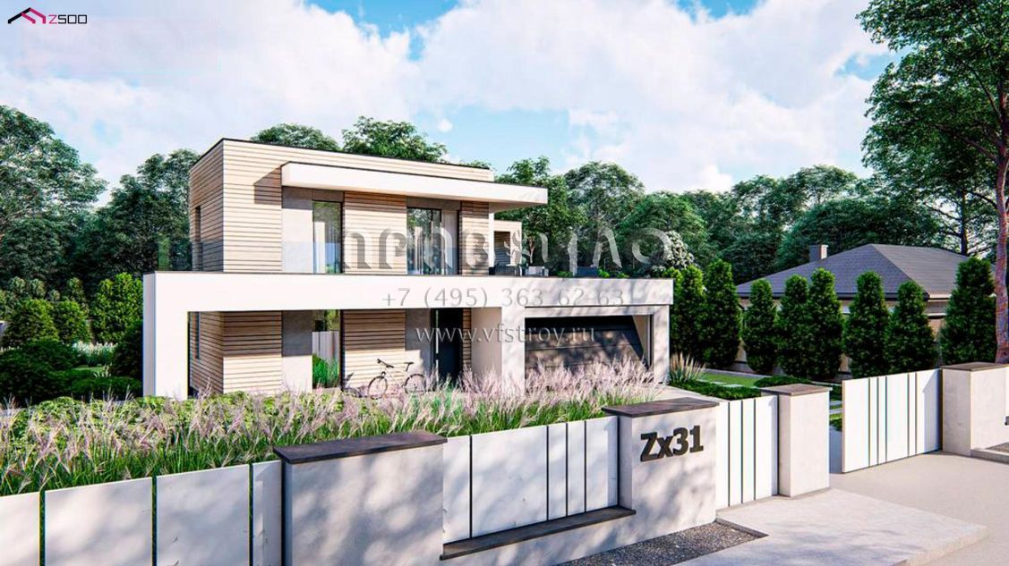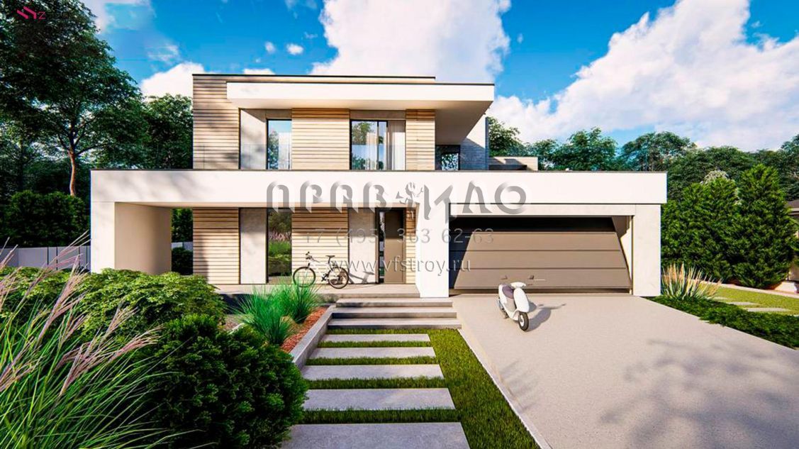 Проект двухэтажного хайтек дома с пятью комнатами, большим гаражом и террасой на втором уровне S3-193 (zx31)