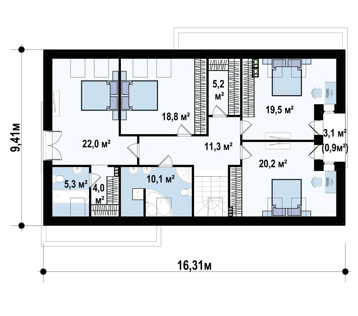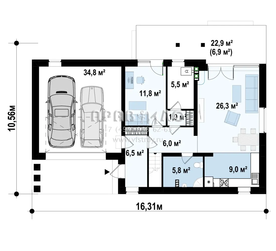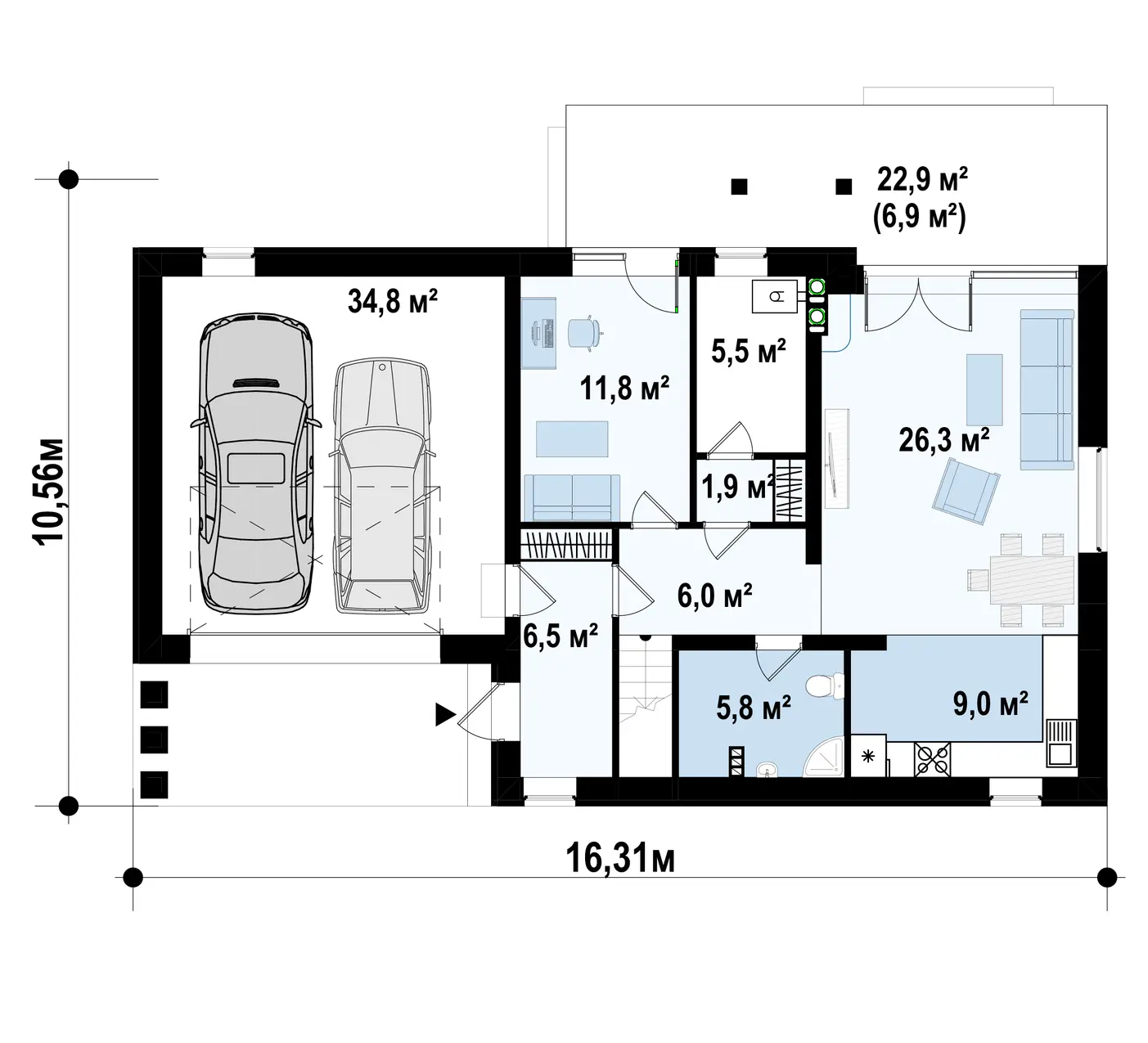 Проект строительства квадратного частного дома с гаражом на два автомобиля S3-223(Z238)