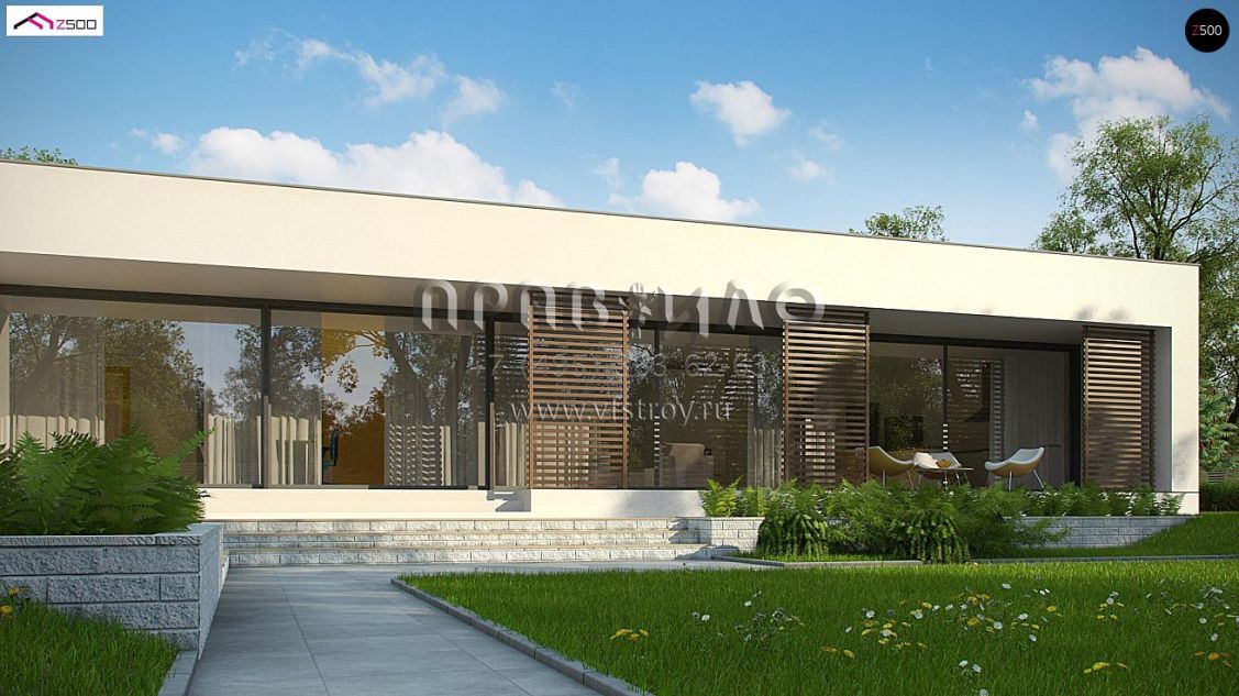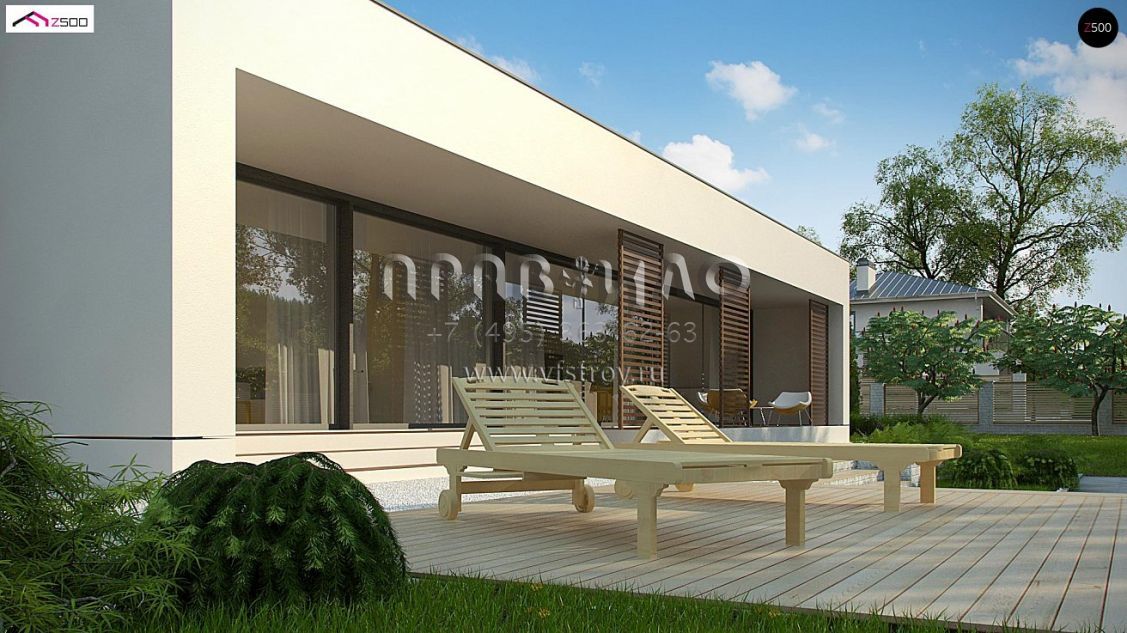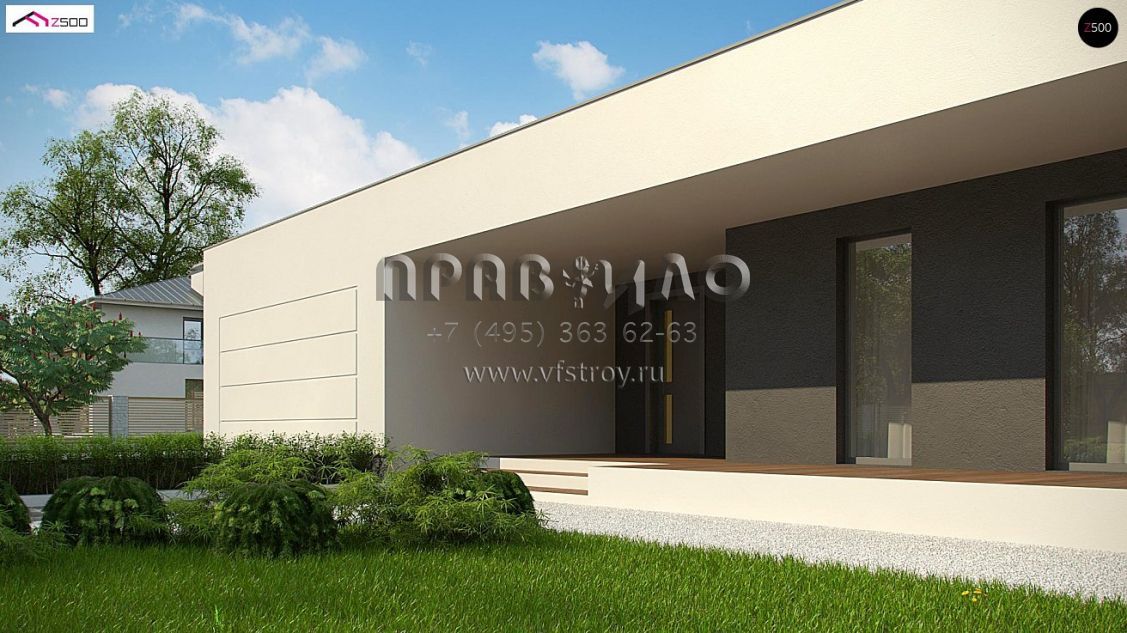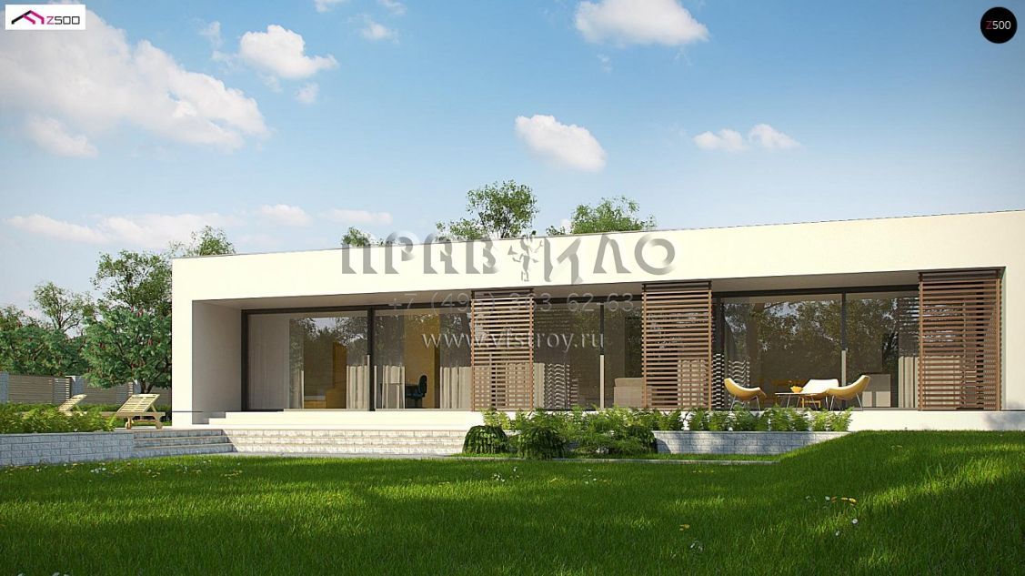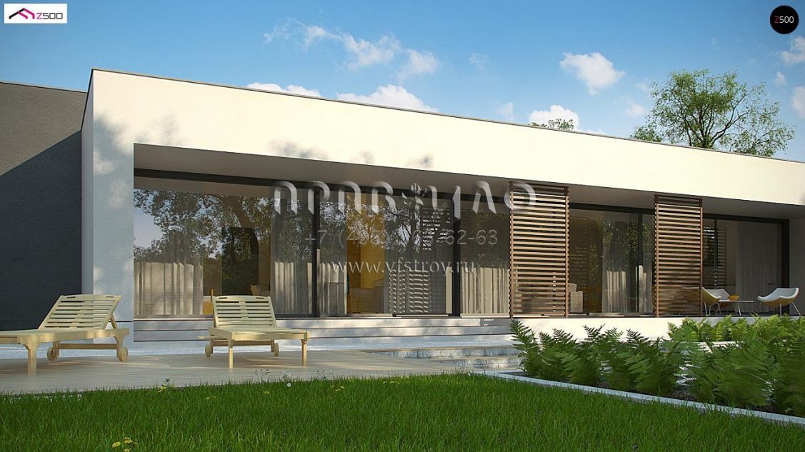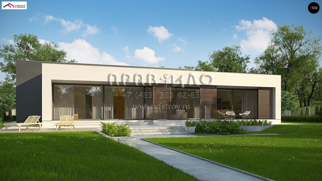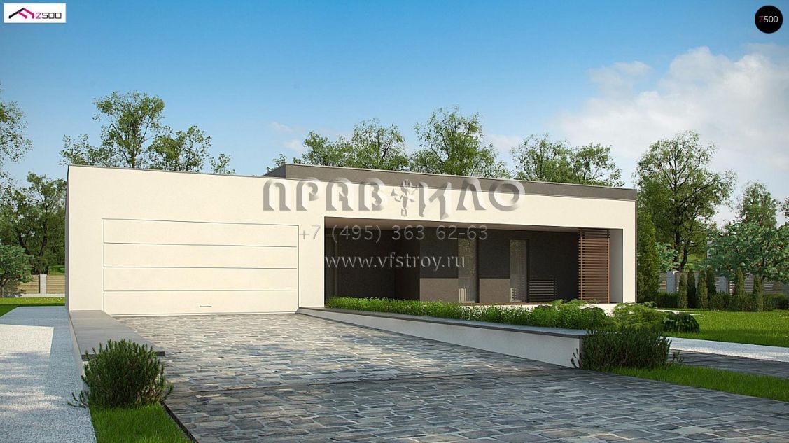 Проект современного одноэтажного дома с гаражом и крытой террасой S3-225-1 (Zx72)