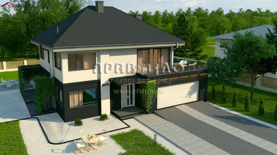 Проект современного двухэтажного дома с гостиной, четырьмя спальнями, гаражом и с большим балконом-террасой на втором уровне S3-227-3 (zx10 v2)