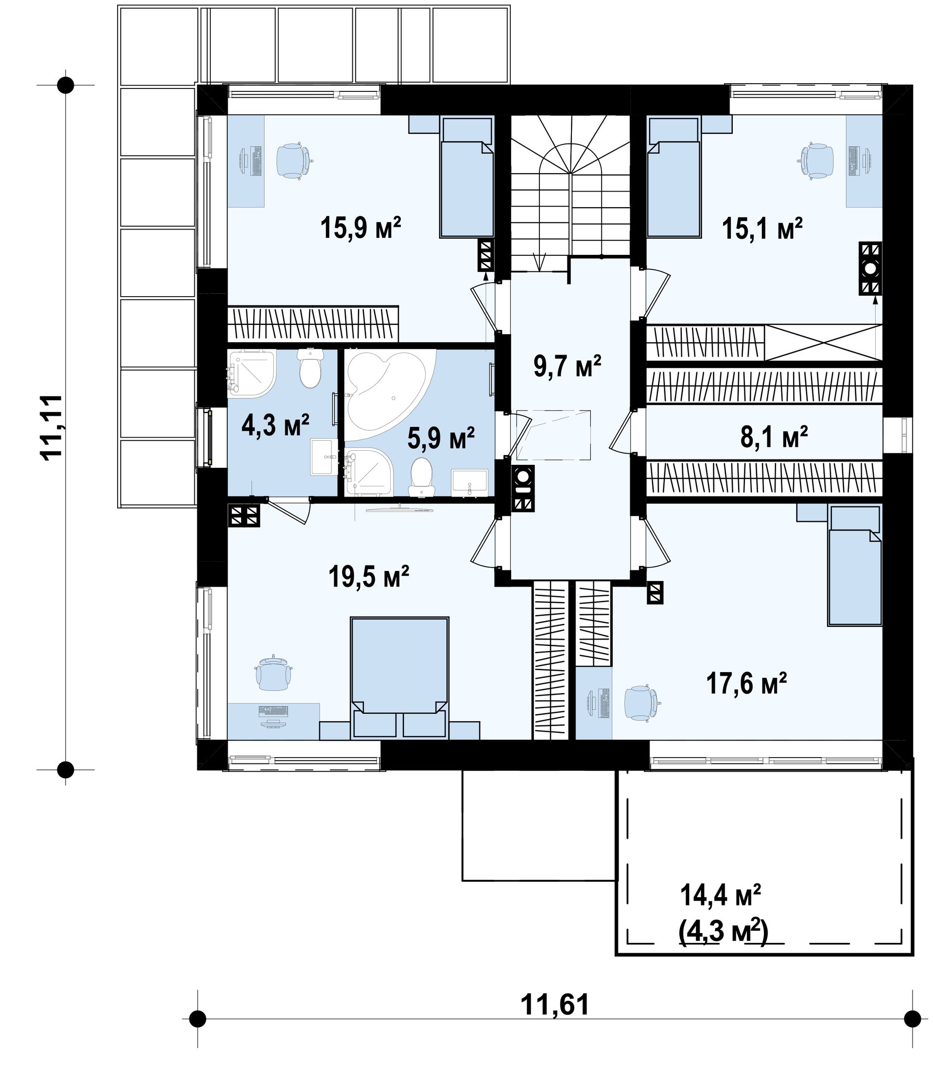 | Возможный материал кровли | металлочерепица, гибкая черепица, керамическая черепица, композитная черепица, цементно-песчаная черепица, фальцевая кровля |