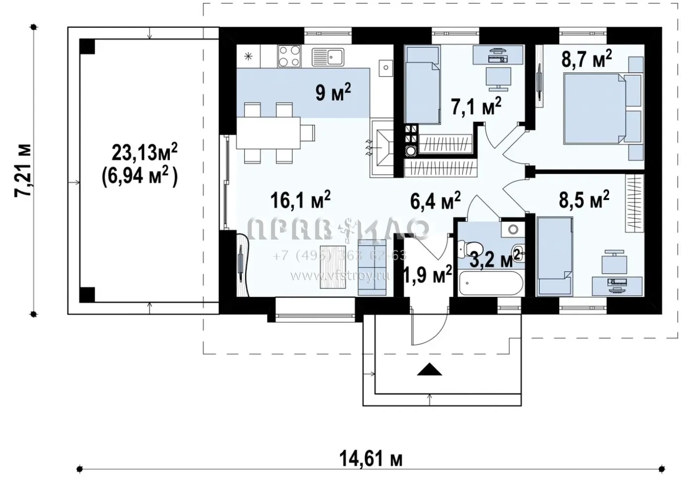 Проект компактного дома с гостиной и тремя спальнями S3-61 (Z139)