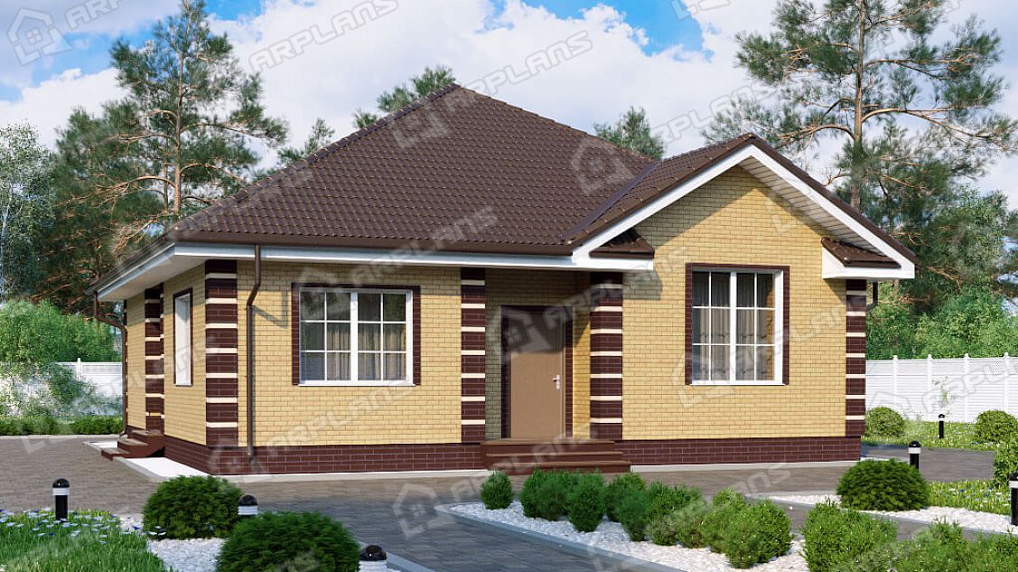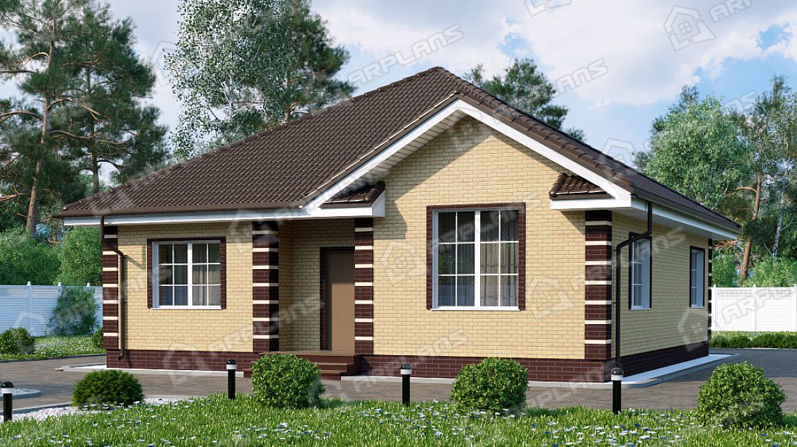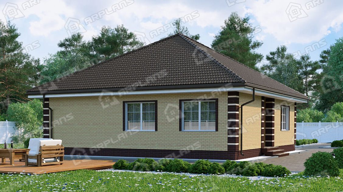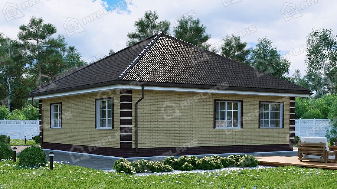S4-100 (К-292) Дом общей площадью 100 кв м. Габариты дома (по краям) - 11.43х11.43 м. Дом квадратной формы, выполнен из газобетона, толщиной 400 мм с облицовкой кирпичом. Перегородки в доме выполнены из деревянного каркаса. Строительство здания осуществляется на фундаменте - монолитная плита. Перекрытие - по плите. Покрытие кровли - металлочерепица. Одноэтажный дом накрыт четырехскатной крышей (шатровая). Вход в дом осуществляется с главного фасада через небольшое крыльцо, "утопленного" внутрь контура дома. Заходим и попадаем в тамбур (5 кв м). При выходе по левую руку расположена спальня 16 кв м, с правой стороны - гостиная 17 кв м. Далее проходя по холлу друг напротив друг размещены газовая котельная и санузел (7 и 8 кв м соответственно). Из котельной предусмотрен выход на улицу. В конце холла размещена кухня-столовая, площадью 21 кв м, и небольшая спальня (11 кв м). Дом подойдет для проживания небольшой семьи из 2-3 человек.