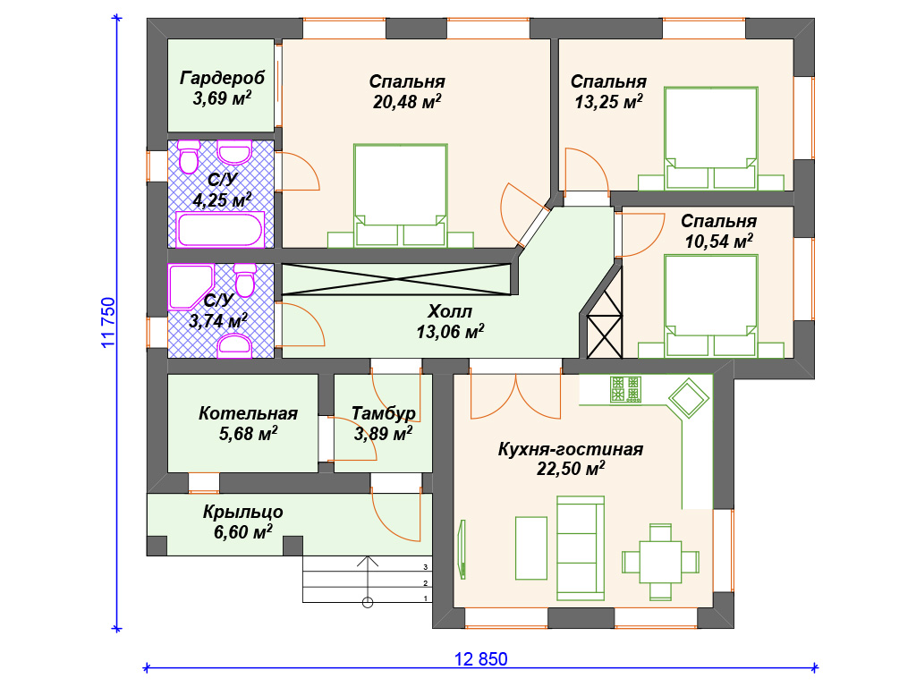 Проект каменного дома с 3 спальнями S4-108 (К-241)