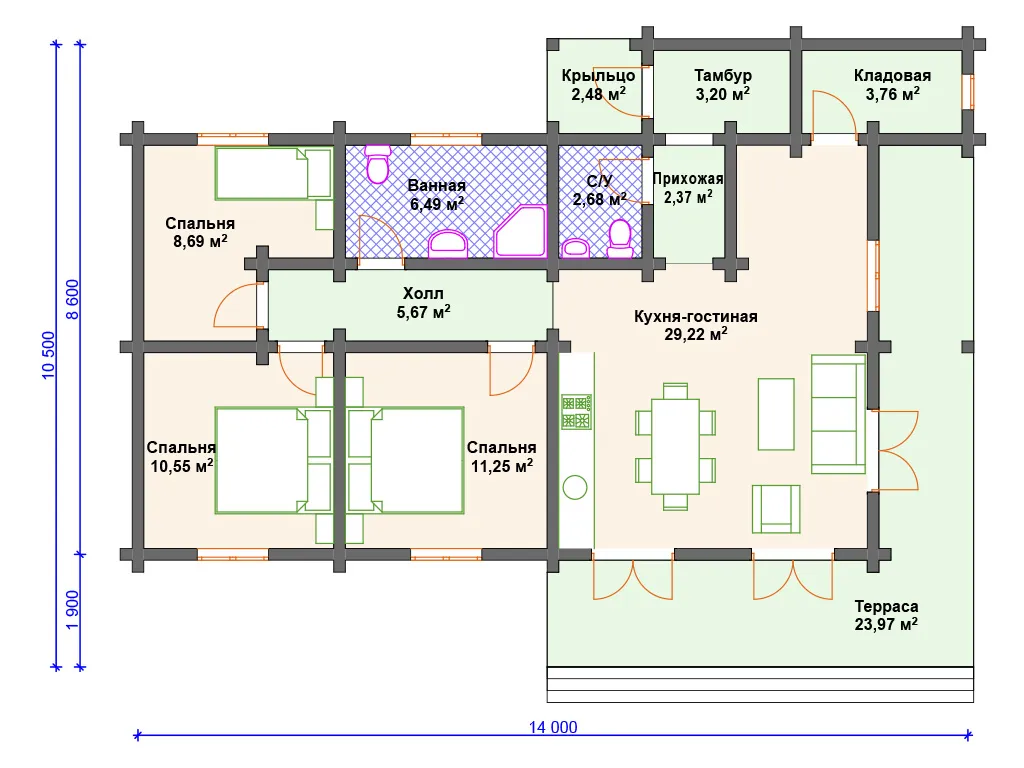 Проект одноэтажного дома с 3 спальнями S4-110 (ДС-124)