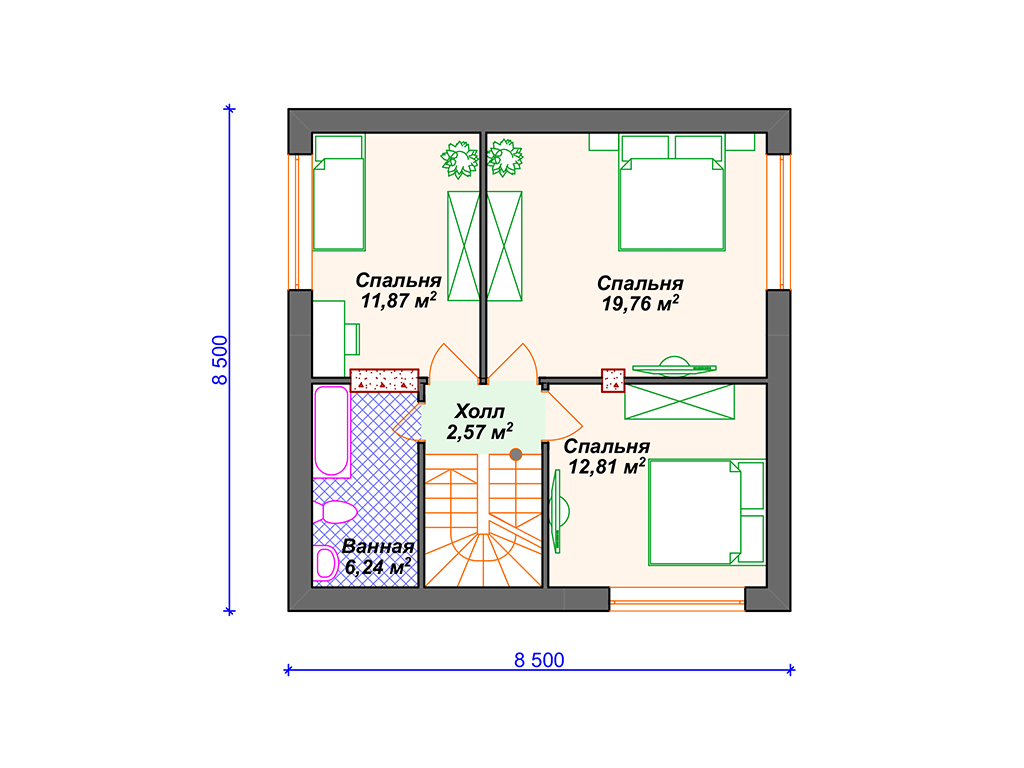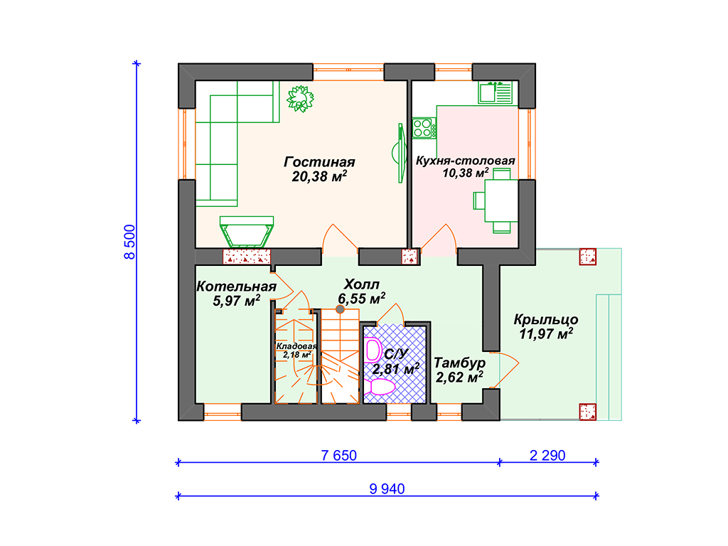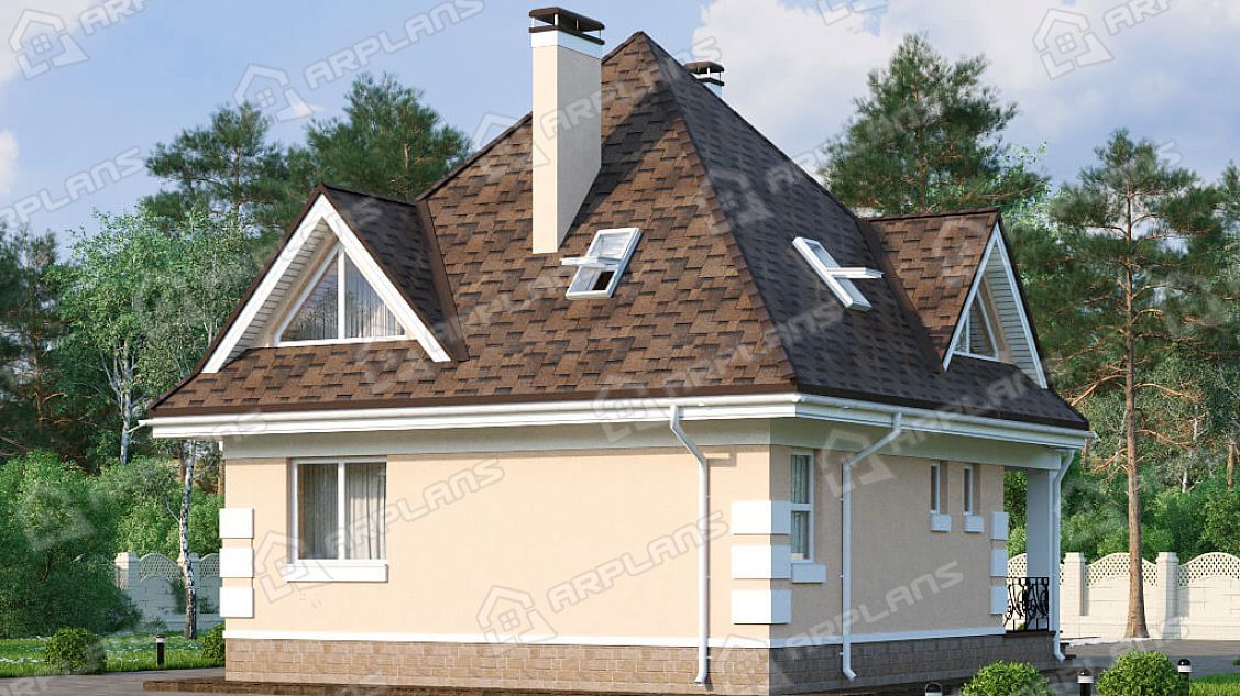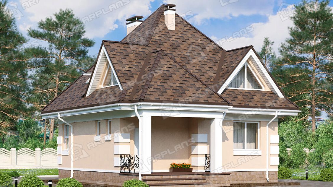 S4-116(К-323) Дом общей площадью 116 кв м. Габариты дома - 8.50х9.94 м. Дом прямоугольной формы, выполнен из газобетона, толщиной 400 мм с облицовкой штукатуркой. Перегородки в доме выполнены из деревянного каркаса 100 мм. Строительство здания осуществляется на фундаменте - монолитная плита. Перекрытия 1 эт - по плите, 2 эт - по деревянным балкам. Покрытие кровли - гибкая черепица (мягкая). Дом двухэтажный, мансардный. Конструкция крыши у дома - сложная, с мансардными окнами. Входим в дом с крыльца 12 кв м накрытого одной крышей с домом. Затем заходим в тамбур, который плавно переходит в холл. По левую руку размещён небольшой с/у 2.8 кв м, далее находится лестница с забежными ступенями на второй этаж. Под лестницей имеется кладовая 2 кв м, для хранения хозяйственного инвентаря. В конце холла - котельная для отопления дома газовым оборудованием. По правой стороне дома расположена кухня-столовая и гостиная. Кухня прямоугольной формы, площадью 10.3 кв м. Гостиная имеет площадь 20 кв м и украшением её служит камин. Верхний этаж обустроен компактно, там находятся три спальни и ванная комната. В каждой из спален имеется шкаф для одежды. Дополнение естественного света в спальни служат мансардные окна. Компактный, небольшой дом позволяющий расположить для постоянного проживания семью из 3-4 человек.