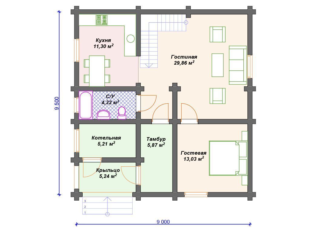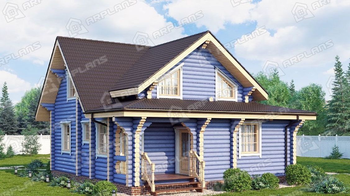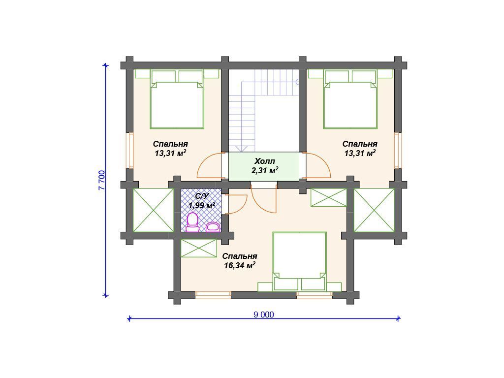 Проект деревянного дома из бревна 9 на 9 м с 3 спальнями S4-122 (ДО-142)