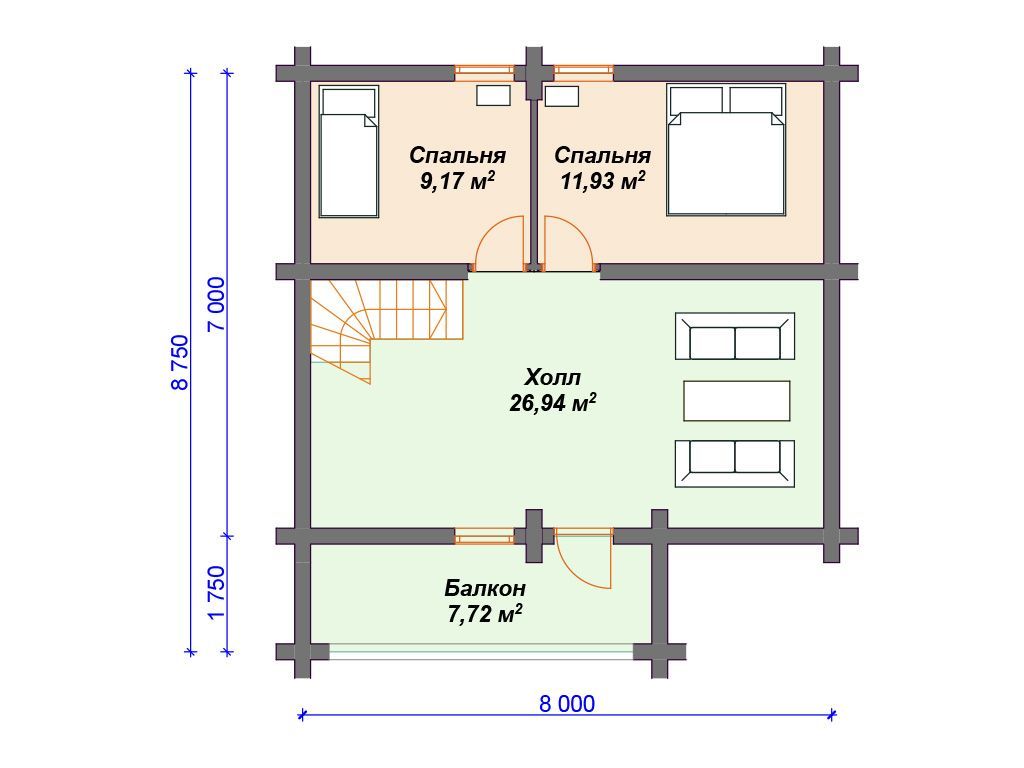 Проект деревянного дома из бревна 8 на 10 м с террасой S4-127 (ДО-095)