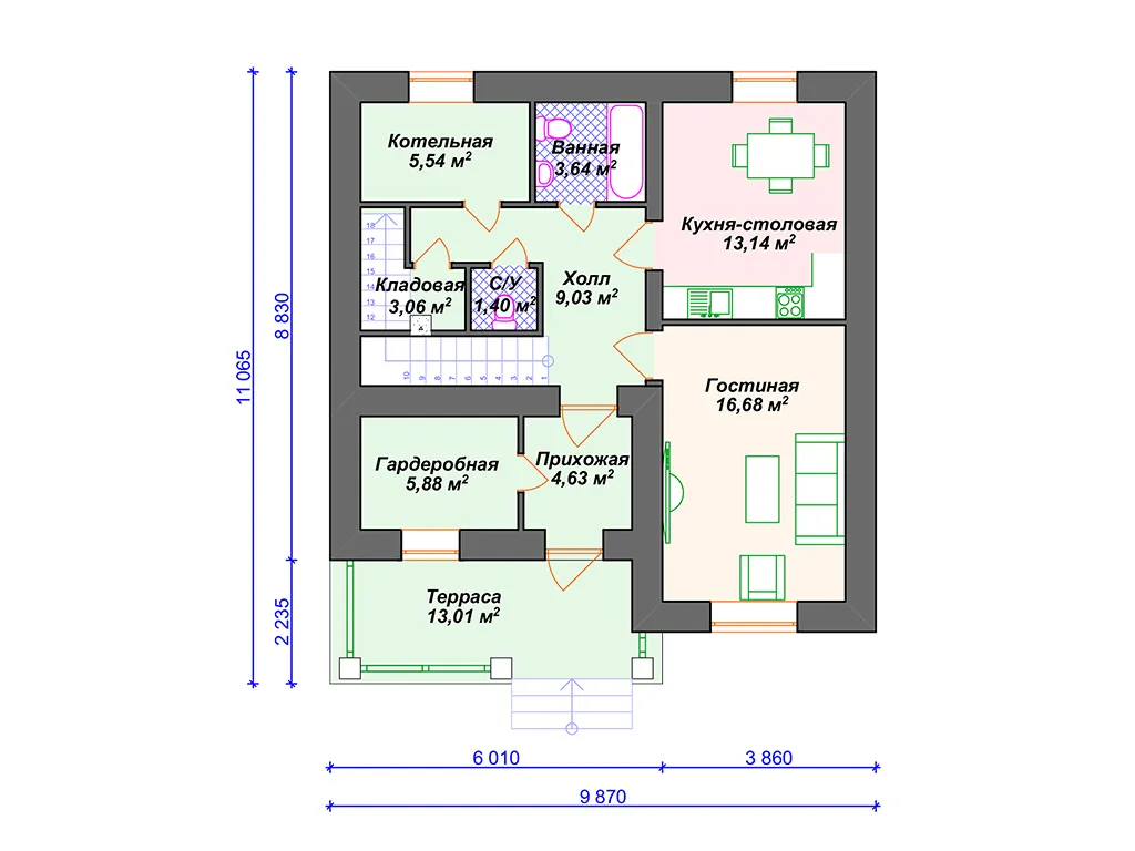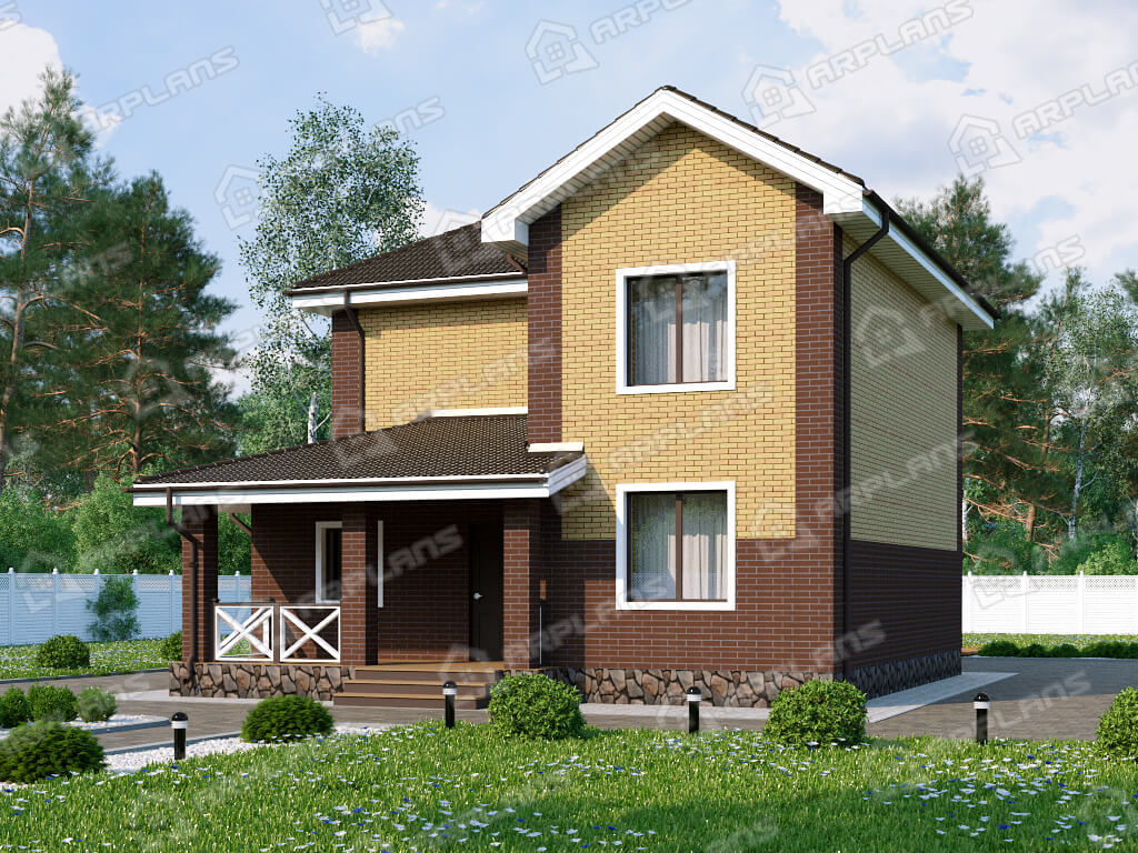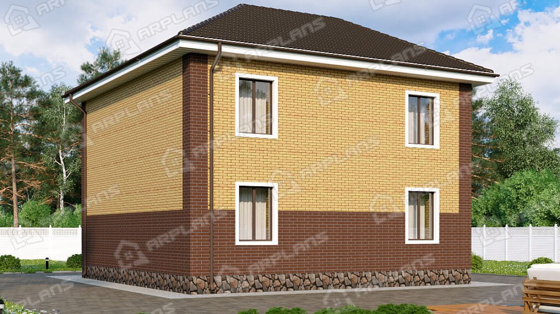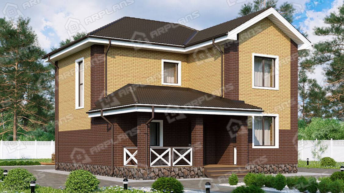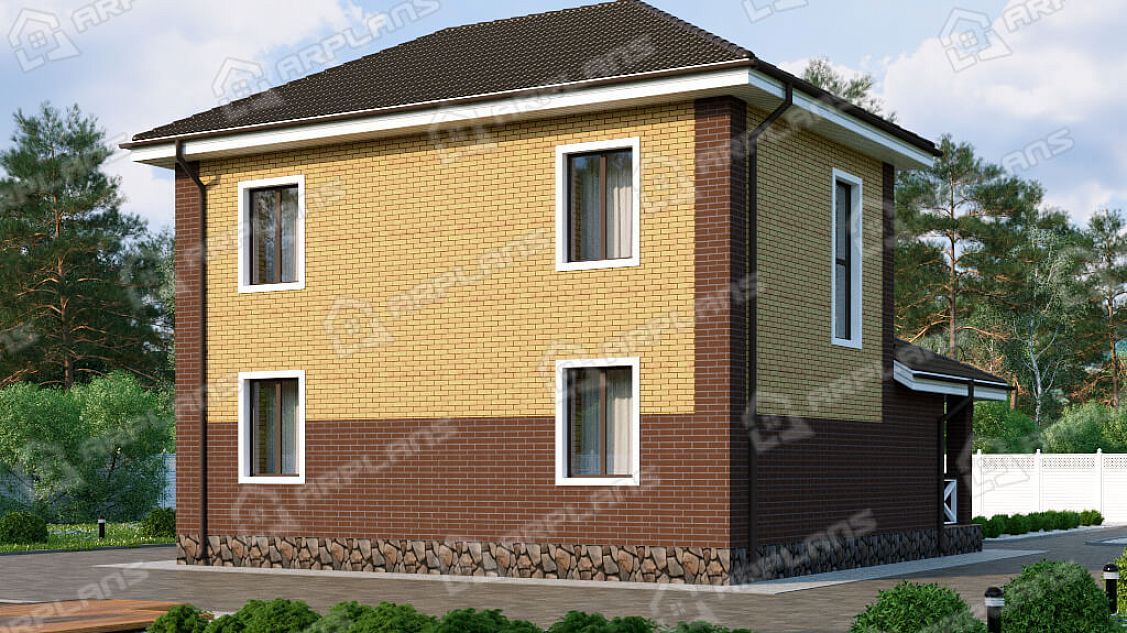 S4-127 (К-350) Дом общей площадью - 127 кв м. Габариты дома - 9.86х11.06 м. Двухэтажный дом с полноценным вторым этажом выполнен из газобетона. Отделка наружных стен - облицовочный кирпич. Конструкция крыши у дома -четырёхскатная. Строительство здания осуществляется на фундаменте - монолитная плита. Перекрытие 1 эт - по плите, 2 эт - монолитное. Покрытие кровли - металлочерепица. Вход в дом осуществляется с террасы расположенной в габаритах дома. Заходим и попадаем в прихожую 4.6 кв м, в которой через небольшую перегородку расположена гардеробная с окном площадью 5.8 кв м. Из прихожей проходим в холл, площадь которого 9 кв м, являющийся центром дома и из него имеется доступ во все помещения. Сразу при входе в холл по левую руку расположена лестница на второй этаж и маленький с/у. Под лестничным маршем - кладовая. В конце холла расположена котельная под газовое оборудование и ванная комната. Правую половину дома занимает гостиная 16.6 кв м и кухня 13 кв м. Кухня и гостиная в доме разделены на 2 отдельных помещения. Поднимаемся на второй этаж и проходим в просторный холл 17.7 кв м. на этаже две спальни 13 кв м и 16.6 кв м, а так же ванная комната 3.6 кв м. Компактный , недорогой дом в строительстве, но позволяющий расположить для проживания семью из 3 человек.