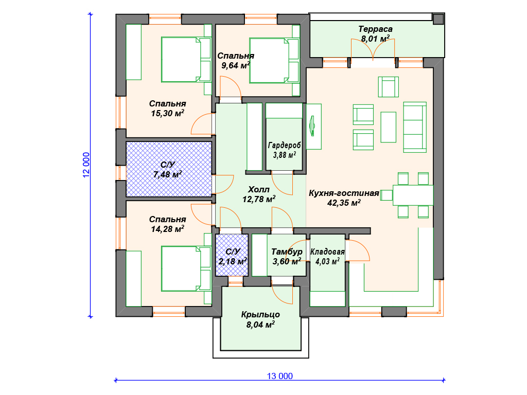 Проект одноэтажного дома с 3 спальнями S4-132 (К-160)