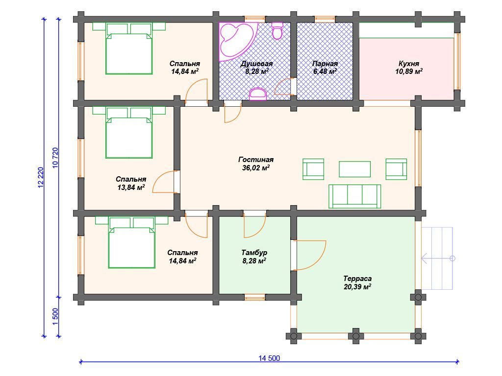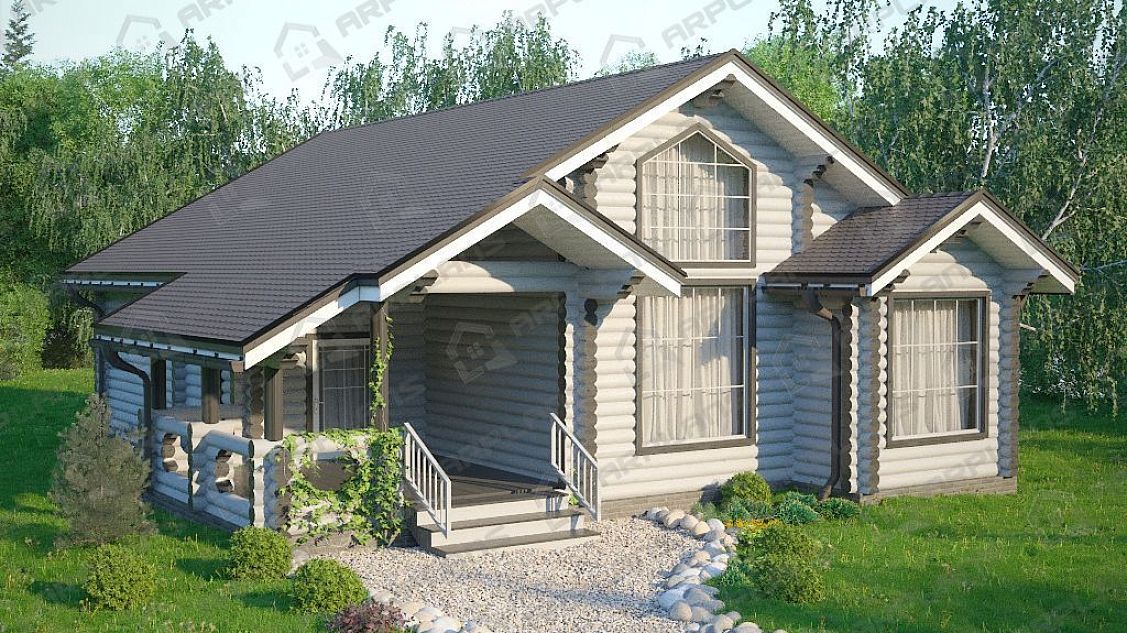 Проект деревянного дома из бревна 12 на 14 м с 3 спальнями S4-134 (ДО-059)