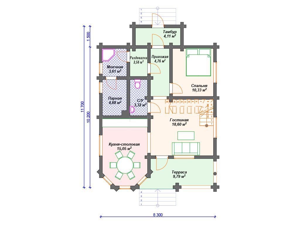 Проект деревянного дома из бревна 8 на 12 м с сауной S4-144 (ДО-054)