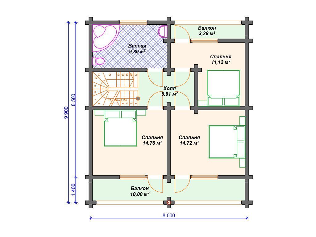 Проект деревянного дома из бревна 8 на 10 м с мансардой S4-145 (ДО-110)