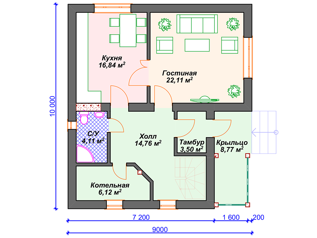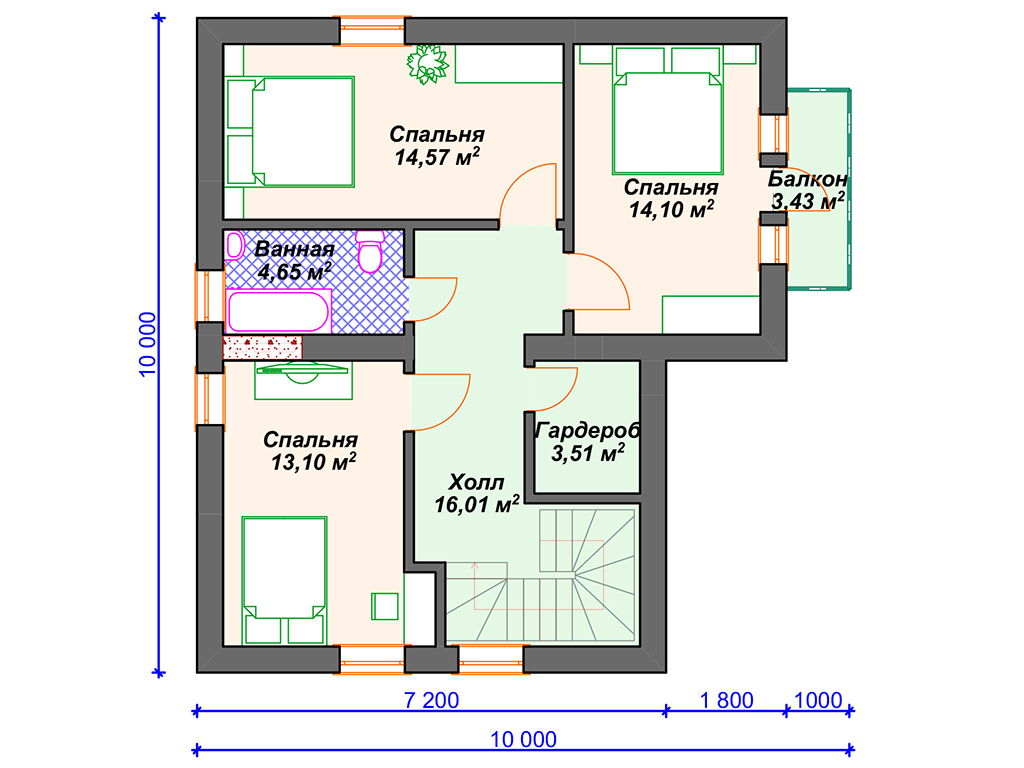 S4-146 (К-036) Дом общей площадью - 146 кв м. Габариты дома - 9.00х10.00 м. Строительство здания осуществляется на свайно-ростверковом фундаменте. Перекрытие 1 и 2 эт - по деревянным балкам. Покрытие кровли -металлочерепица. Входим в дом с крыльца и попадаем в тамбур 3.5 кв м. Далее проходим в просторный холл 14.7 кв м, откуда сразу можно попасть во все помещения дома. На этаже расположены гостиная 22 кв м, кухня 16.8 кв м, с/у 4 кв м с душевой кабиной и котельная 6 кв м. Лестница на второй этаж размещена очень удобно, сразу при входе в холл с левой стороны. Кухня и гостиная в доме разделены на 2 отдельных помещения. Обеденная зона расположена у окна. Котельная предназначена для размещения газового оборудования. Верхний этаж обустроен очень компактно, там находятся три спальни, гардеробная и ванная комнаты. Две спальни по 14 кв м (одна из них с выходом на балкон) и одна спальня 13 кв м. Гардероб 3.5 кв м и ванная 4.6 кв м с окном. Практичный внутри и привлекательный снаружи дом для круглогодичного проживания семьи из 4 человек.