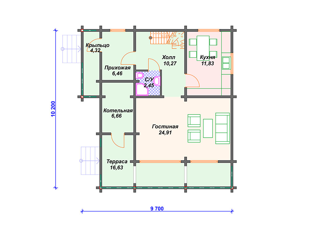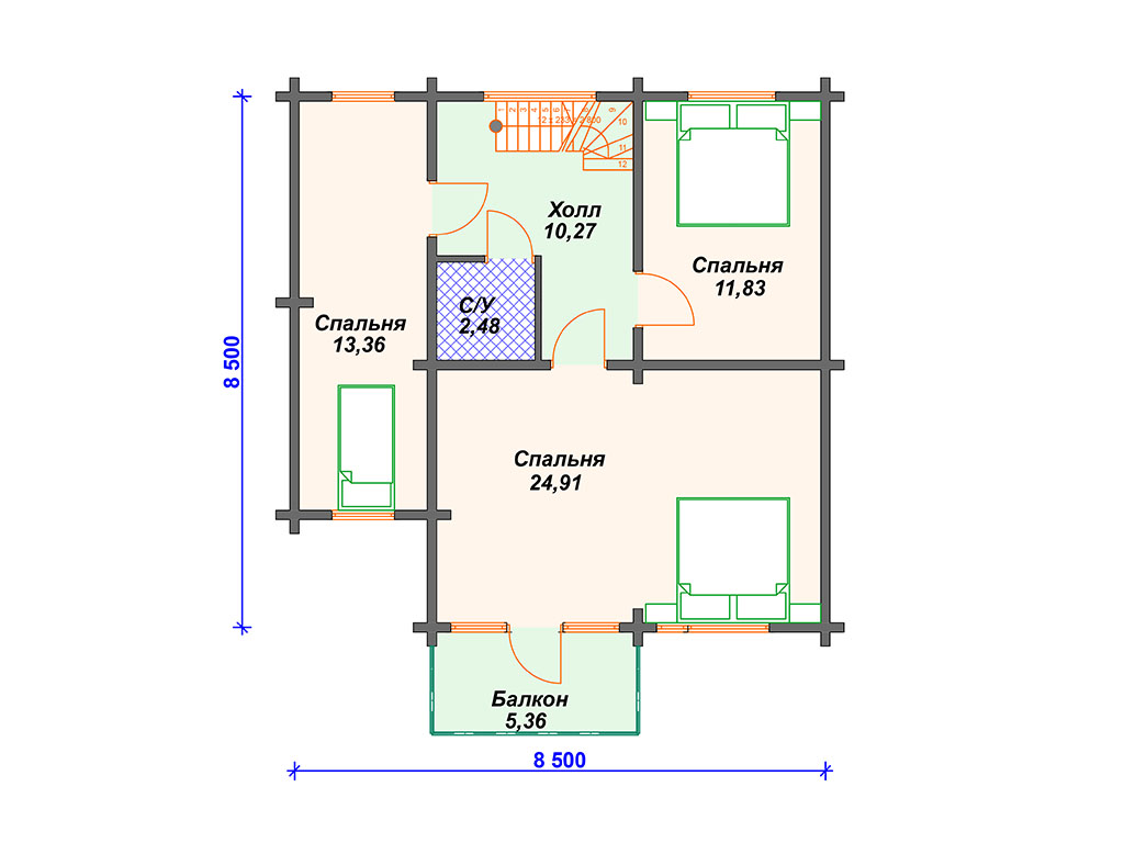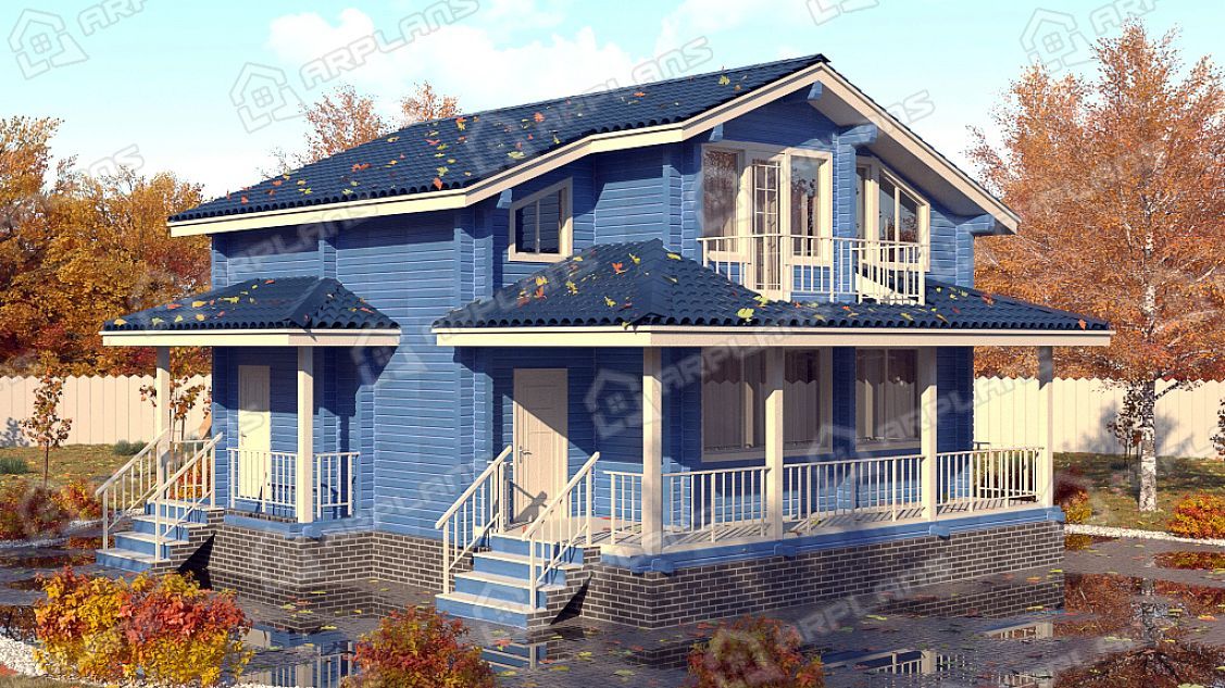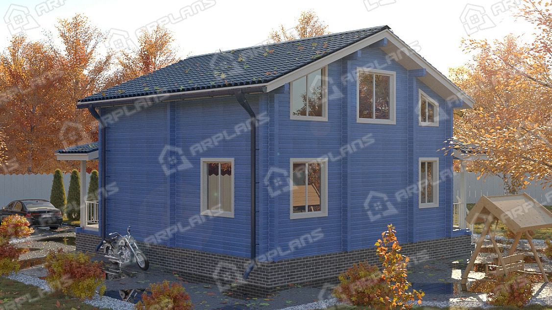 S4-151 (ДС-028) Деревянный дом почти квадратной формы, выполнен из бруса 150х150 мм. Конструкция кровли - простая двухскатная. Строительство здания осуществляется на ленточном монолитном фундаменте. На первом этаже сформирована дневная зона - гостиная 24.9 кв м, кухня 11.83 кв м и маленький с/у 2.45 кв м. В дом заходим с крыльца и проходим в прихожую, которая имеет освещение через окно. Далее попадаем в холл, из которого сразу открывается межэтажная лестница. Для отопления дома предусмотрена котельная, по площади позволяющая разместить газовое оборудование. Вход предусмотрен с террасы, расположенной со стороны гостиной. Второй этаж спальная зона из трёх комнат: 11.83 кв м, 13.36 кв м и 24.91 кв м. В большей по площади спальне предусмотрен выход на балкон, расположенный над террасой. Так же на этаже имеется маленький с/у. Планировка этого дома очень удобная и комфортная для жизни семьи из 4 человек.