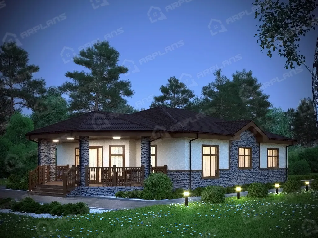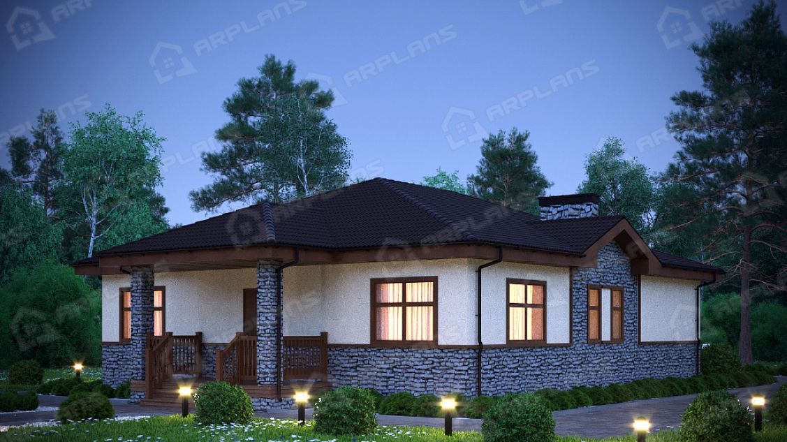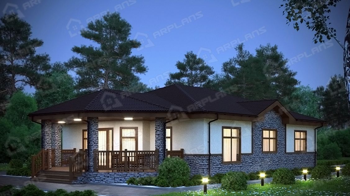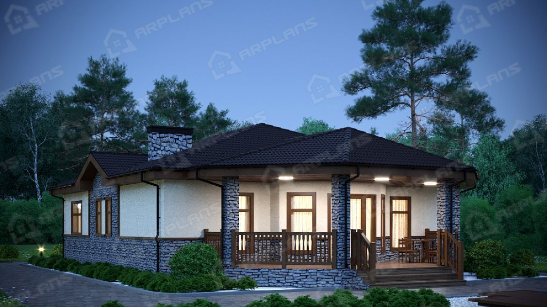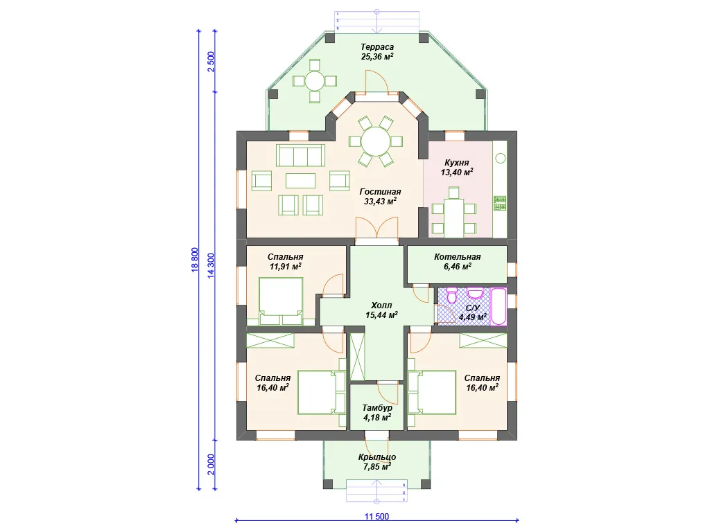 S4-155 (К-221) Проект красивого одноэтажного дома из газобетона К-221. Общая площадь дома - 155 кв.м, габариты с террасой 18.80х11.50 м. Дом из газобетонных блоков с облицовкой штукатуркой с 3 спальнями. Одноэтажный дом прямоугольной формы с небольшим эркером и украшающей дом террасой, повторяющей линии эркера. Конструкция крыши - "конвертом", не утепленная (чердак холодный). Вход в дом осуществляется через небольшое крытое крыльцо, попадаем в небольшой тамбур, который отсекает холодный воздух. Далее коридор, с мини-гардеробной (встроенный шкаф в холле).Из холла в центре дома можно попасть в любое помещение. В доме 3 спальни, небольшой санузел в 4.5 кв м, газовая котельная. Гостиная в доме большая - 33,5 кв м. Украшает ее эркер, в котором можно поставить обеденный стол. Кухня, площадью 13.4 кв м, отделена от гостиной несущей стеной. В проекте предложено оставить пустой проем между кухней и гостиной, но можно вставить и распашную дверь, чтобы избежать попадание запахов и шума в зону отдыха. Дом подойдет для постоянного проживания семьи из 4-5 человек.