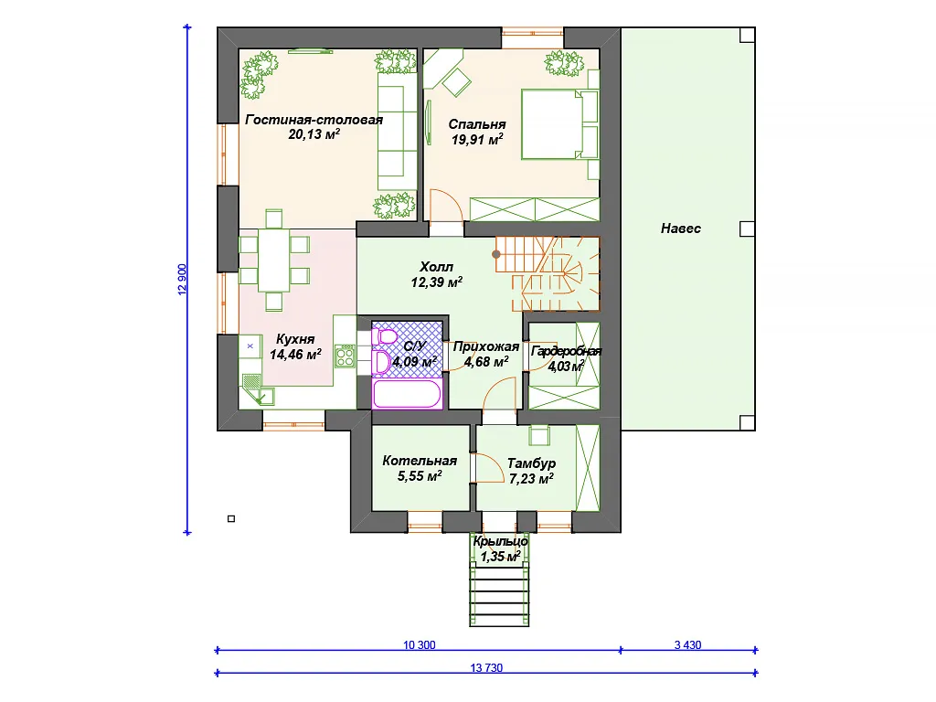Проект каменного дома с навесом для машины S4-168 (К-274)