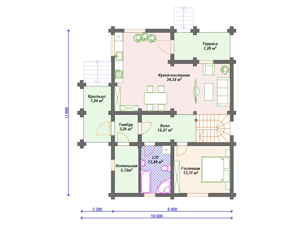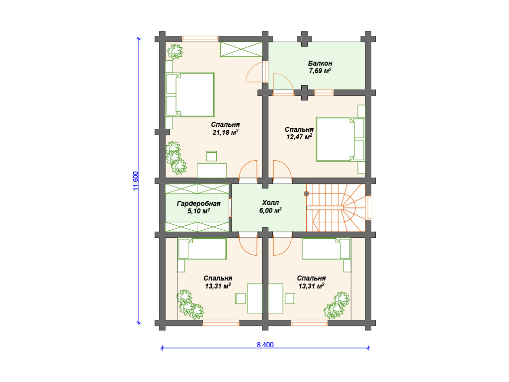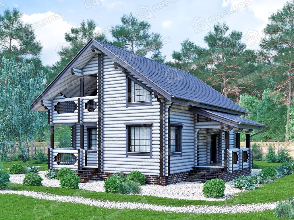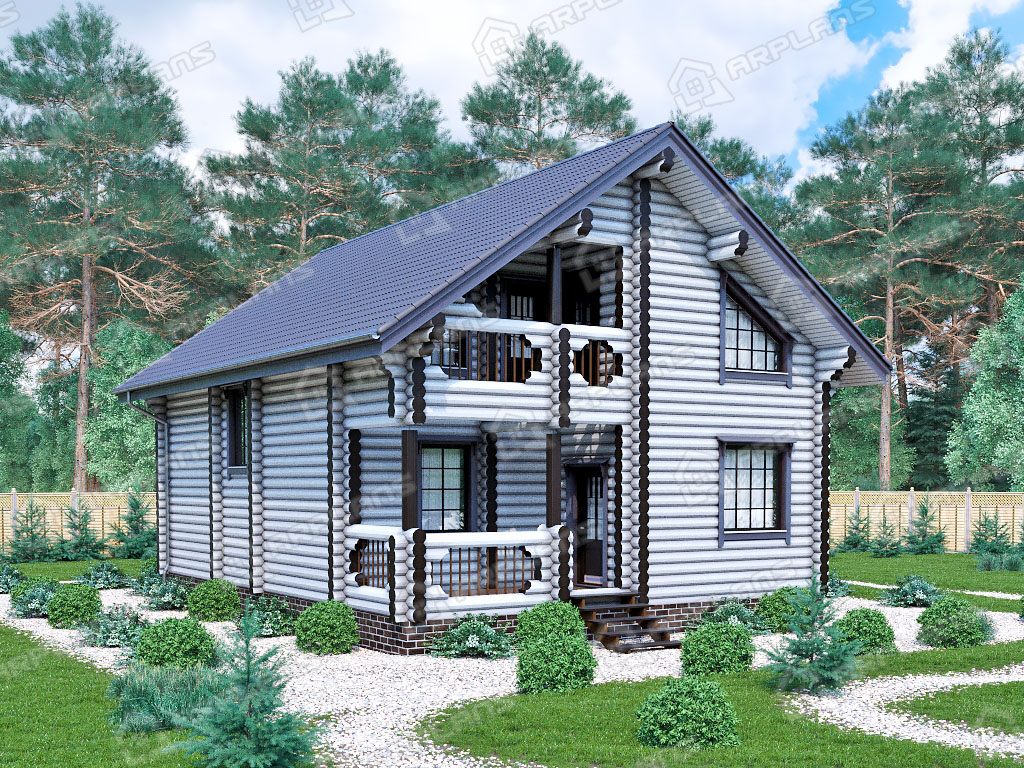 Проект деревянного дома из бревна 8 на 11 м с мансардой и террасой S4-176 (ДО-011)