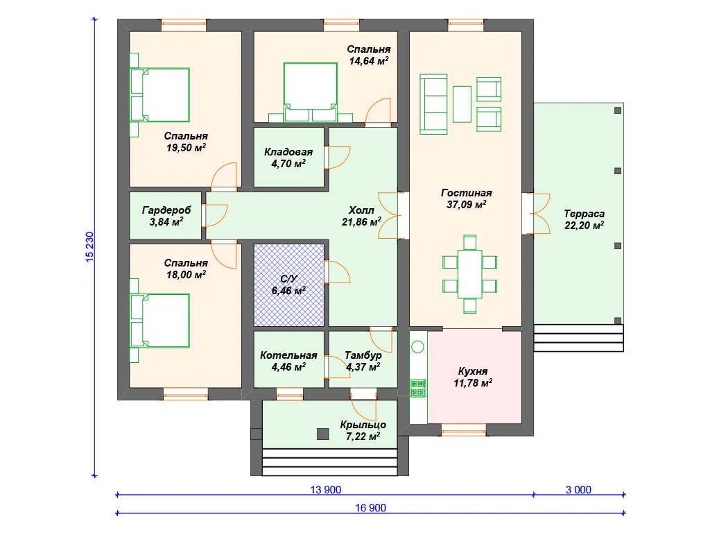 Проект одноэтажного дома с 3 спальнями и террасой S4-176 (К-211)