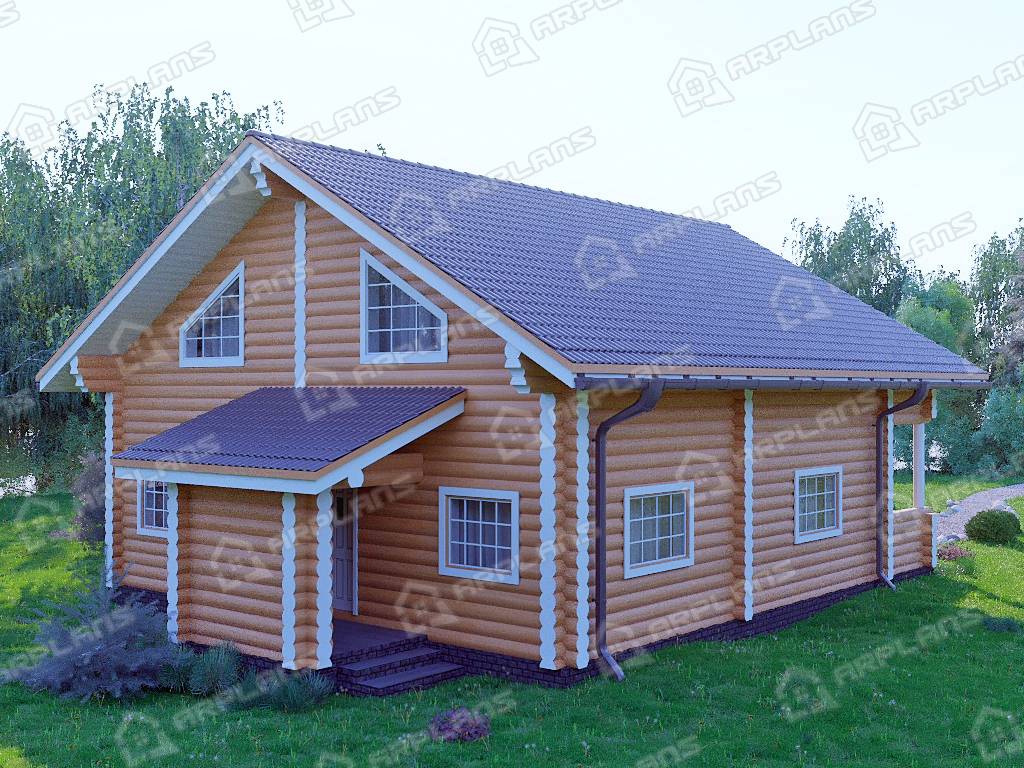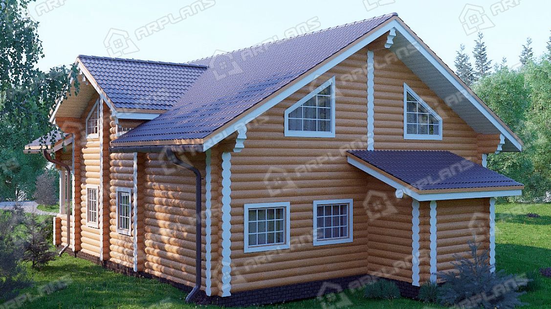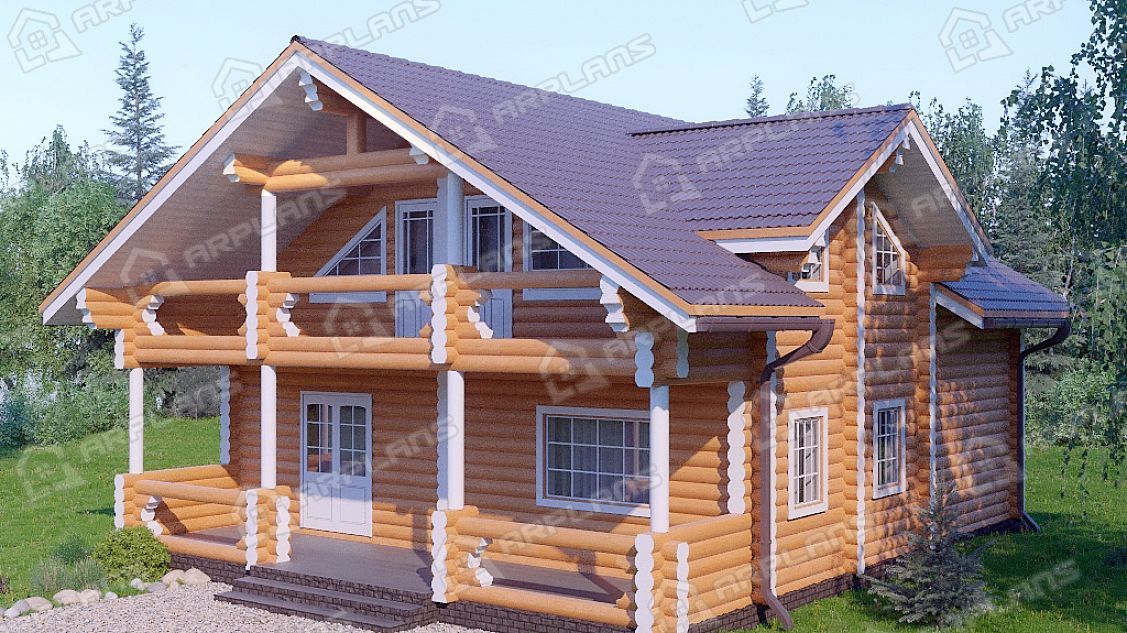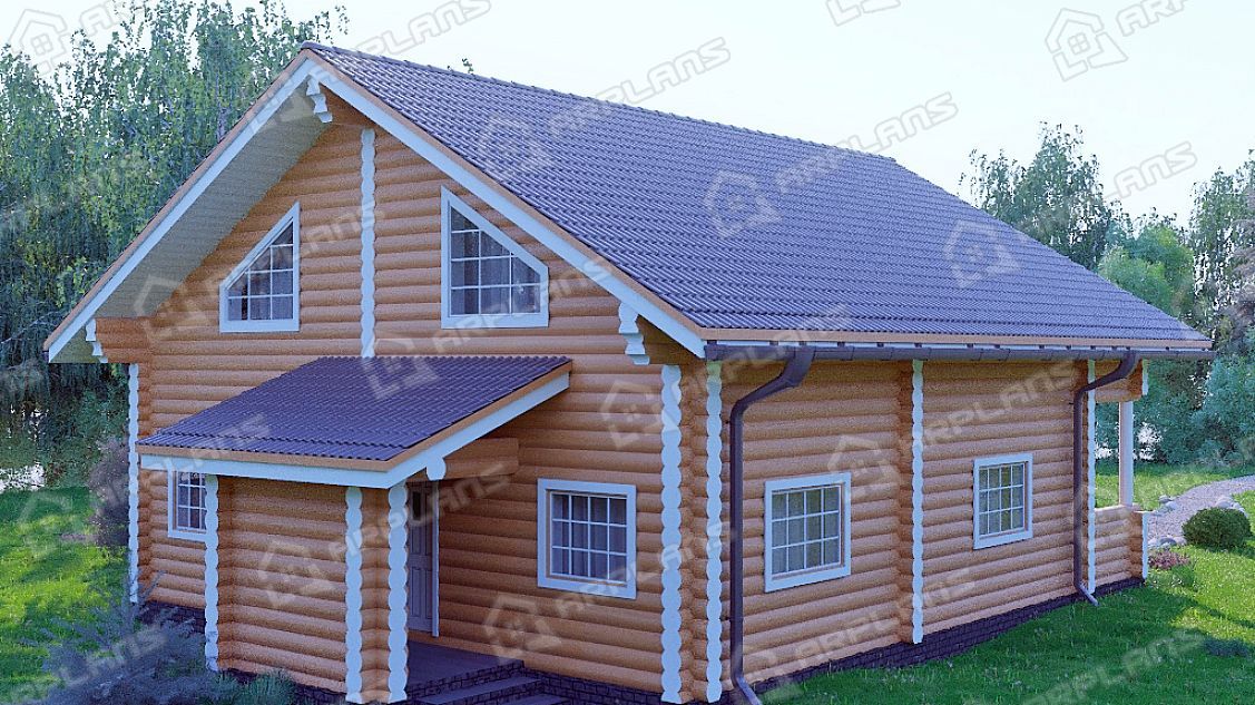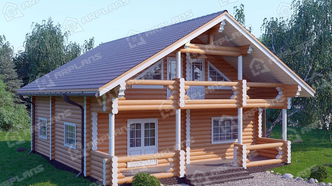 Проект деревянного дома из бревна 9 на 11 м с мансардой и террасой S4-187 (ДО-034)
