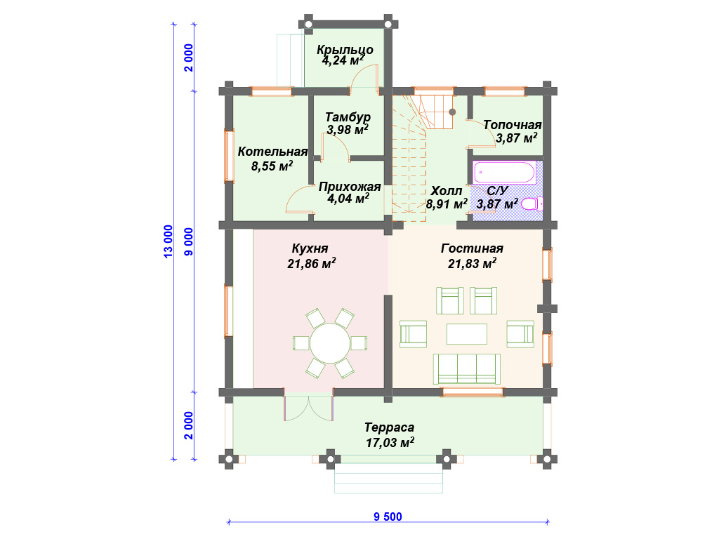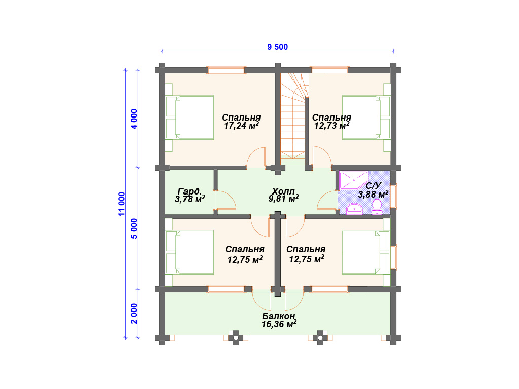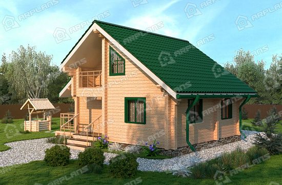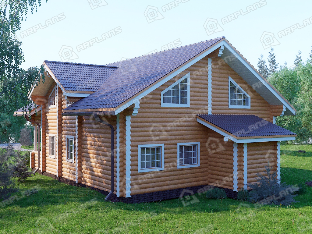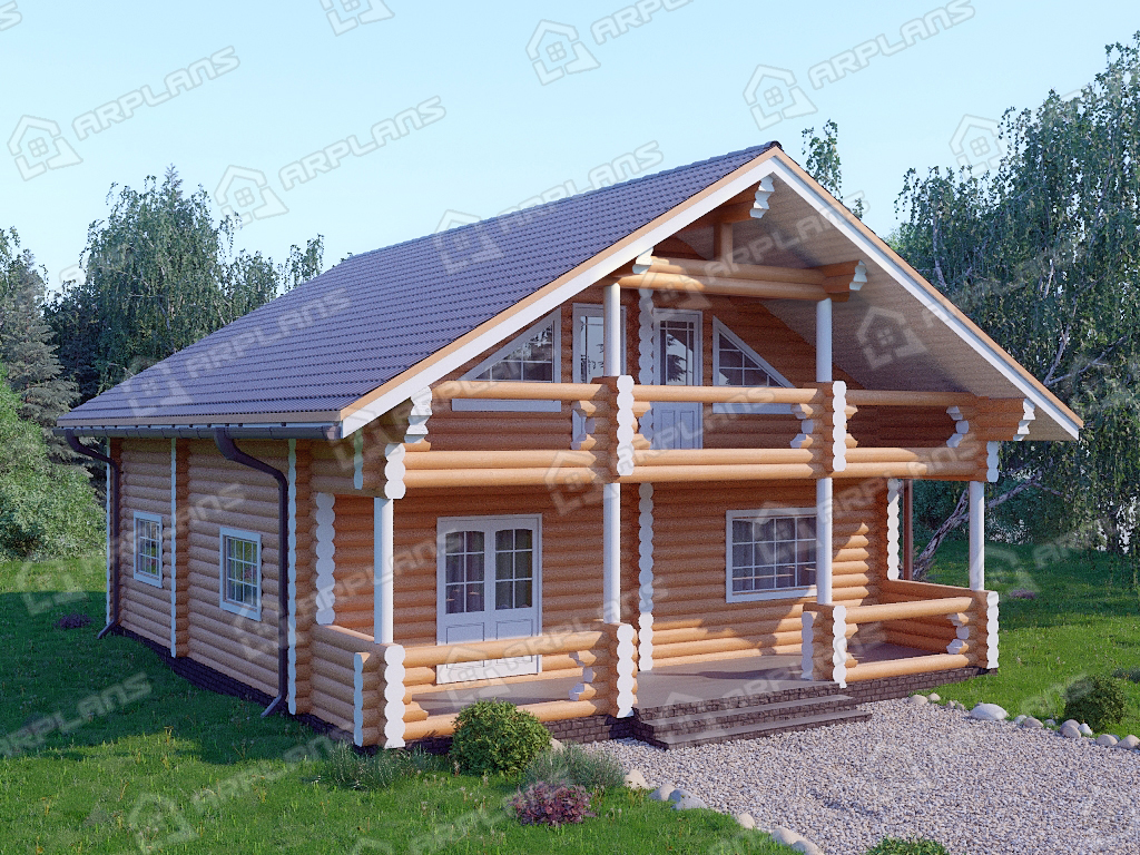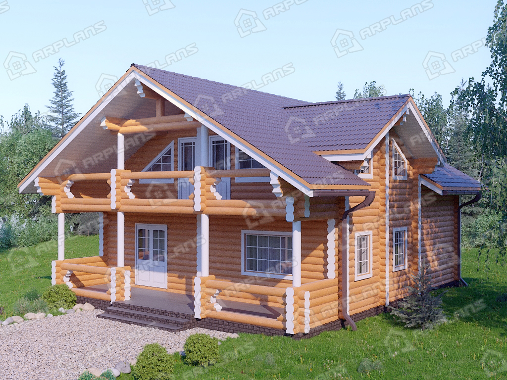 Проект деревянного дома из бревна 9 на 11 м с мансардой и террасой S4-187 (ДО-034)