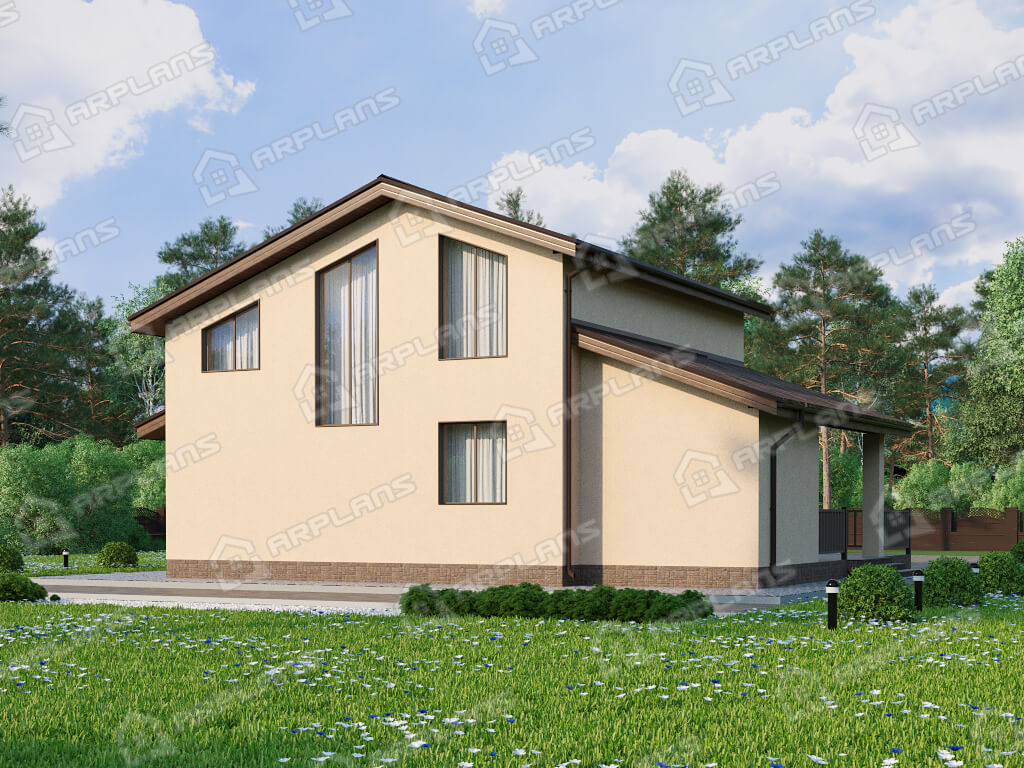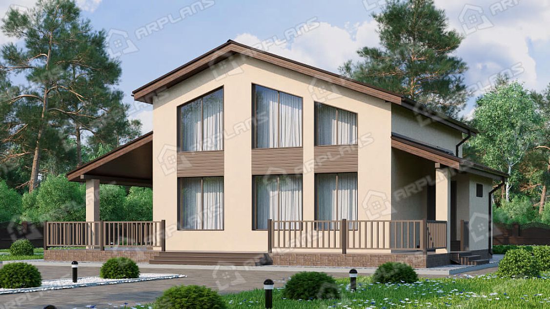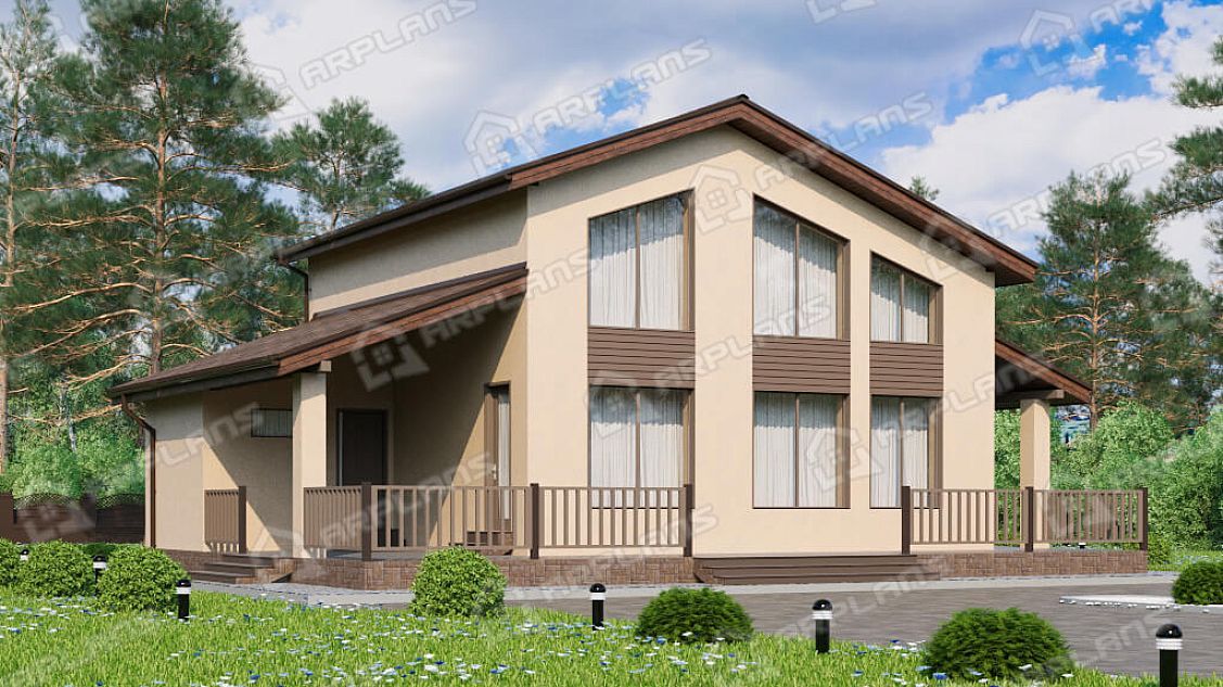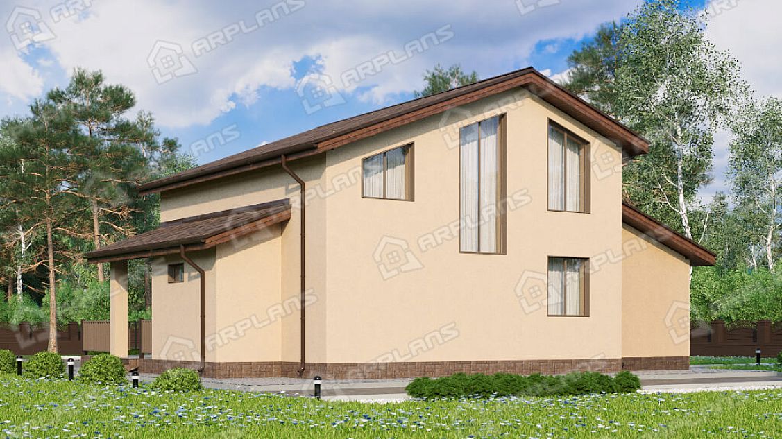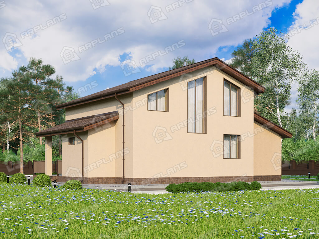 S4-191 (К-328) Дом общей площадью 191 кв м. Габариты дома - 11.75х14.55 м. Дом прямоугольной формы, выполнен из газобетона, толщиной 400 мм с отделкой наружных стен - штукатурка. Строительство здания осуществляется на фундаменте - монолитная плита . Перекрытия 1 эт - по плите, 2 эт - ж/б плиты. Покрытие кровли - гибкая черепица (мягкая). Дом двухэтажный мансардный, накрыт простой двухскатной крышей. Входим в дом с просторной террасы п-образной формы, площадью 54.6 кв м. Заходим в тамбур, который имеет естественное освещение через окно. В тамбуре можно разместить небольшую гардеробную (вешалки) для верхней одежды. Далее проходим в холл. Сразу при входе с правой стороны два небольших помещения - с/у и ванная. Рядом расположена лестница на второй этаж (освещается небольшим окном). Проходя прямо через холл попадаем в спальню 12.6 кв м. Во второй правой части дома размещены кухня (14 кв м) и гостиная (22 кв м). Они объединены в одно помещение, но есть маленькая перегородочка, при желании, кухню можно и отгородить. Из кухни предусмотрен выход на просторную террасу, на которой можно разместить мебель для отдыха. Котельная предусмотрена для газового оборудования и пристроена к дому. Благодаря решению вынести котельную в пристройку, мы выигрываем полезную площадь для дома. Поднимаемся на второй этаж и попадаем в просторный холл 15 кв м. Пройдя прямо, мы попадаем на балкон внутри дома (второй свет) с видом на фасад с большими окнами. Второй свет выходит на главный фасад дома над зоной гостиной. Их холла можно пройти в любую из 3-х спален. Спальни небольшие, 2 из них рассчитаны под односпальные кровати. В каждой из спален спроектирован встроенный шкаф. Так же на этаже имеется ванная комната почти 4 кв м. Загородный дом для любителей второго света в доме. Прекрасно подойдёт для постоянного проживания семи из 4 человек.