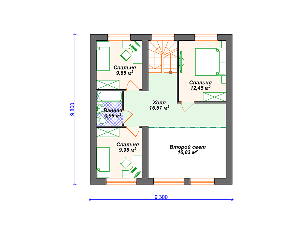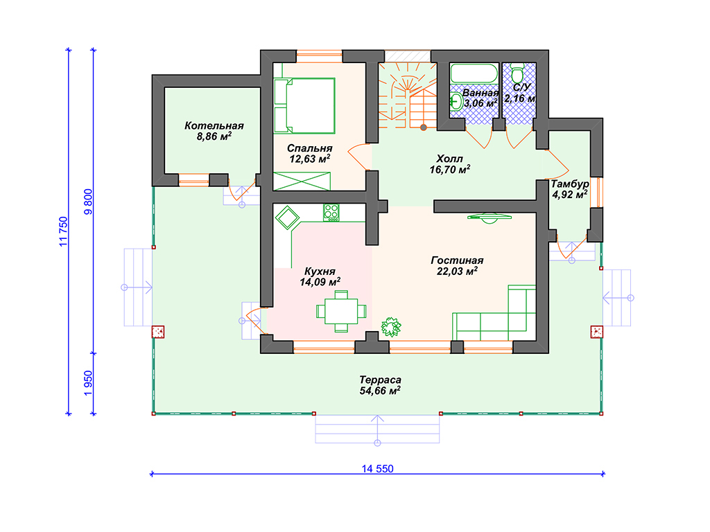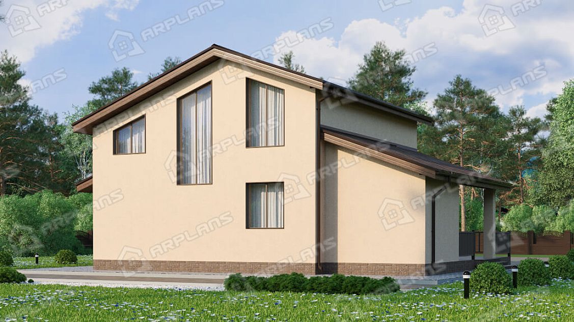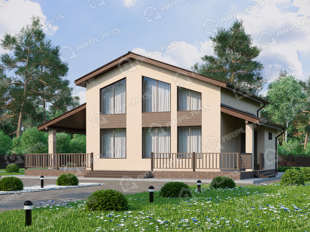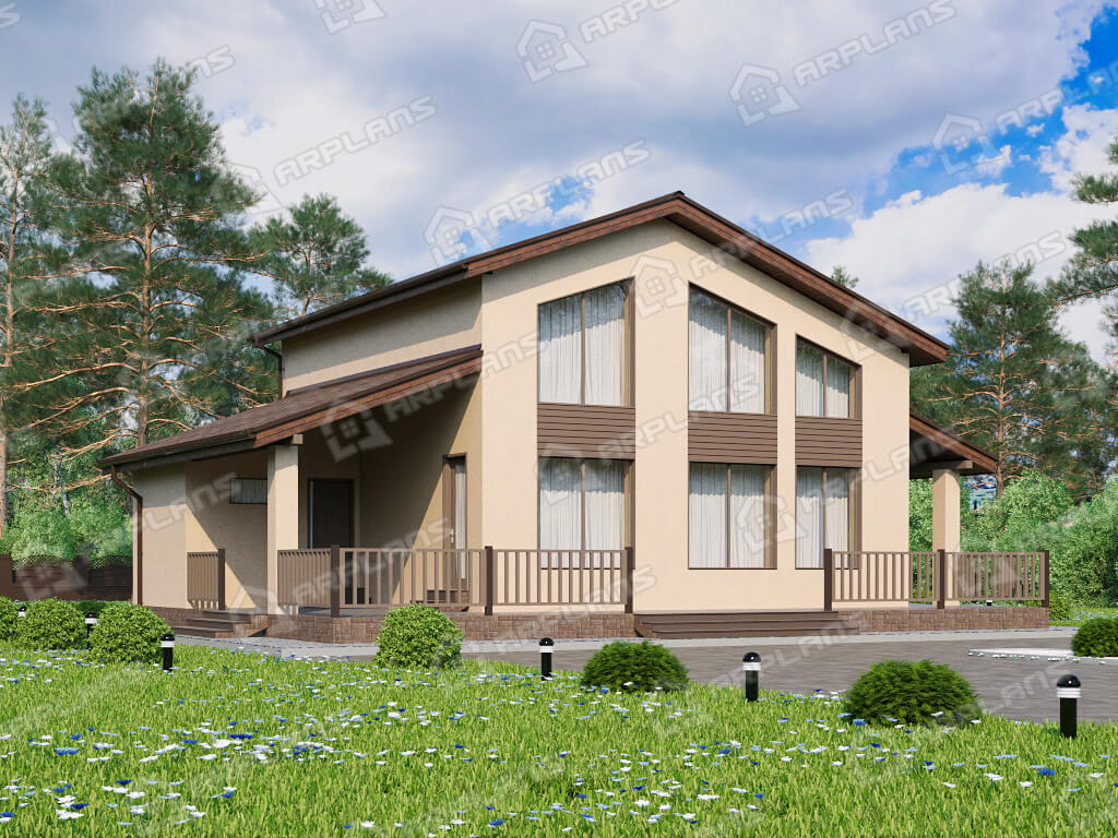 S4-191 (К-328) Дом общей площадью 191 кв м. Габариты дома - 11.75х14.55 м. Дом прямоугольной формы, выполнен из газобетона, толщиной 400 мм с отделкой наружных стен - штукатурка. Строительство здания осуществляется на фундаменте - монолитная плита . Перекрытия 1 эт - по плите, 2 эт - ж/б плиты. Покрытие кровли - гибкая черепица (мягкая). Дом двухэтажный мансардный, накрыт простой двухскатной крышей. Входим в дом с просторной террасы п-образной формы, площадью 54.6 кв м. Заходим в тамбур, который имеет естественное освещение через окно. В тамбуре можно разместить небольшую гардеробную (вешалки) для верхней одежды. Далее проходим в холл. Сразу при входе с правой стороны два небольших помещения - с/у и ванная. Рядом расположена лестница на второй этаж (освещается небольшим окном). Проходя прямо через холл попадаем в спальню 12.6 кв м. Во второй правой части дома размещены кухня (14 кв м) и гостиная (22 кв м). Они объединены в одно помещение, но есть маленькая перегородочка, при желании, кухню можно и отгородить. Из кухни предусмотрен выход на просторную террасу, на которой можно разместить мебель для отдыха. Котельная предусмотрена для газового оборудования и пристроена к дому. Благодаря решению вынести котельную в пристройку, мы выигрываем полезную площадь для дома. Поднимаемся на второй этаж и попадаем в просторный холл 15 кв м. Пройдя прямо, мы попадаем на балкон внутри дома (второй свет) с видом на фасад с большими окнами. Второй свет выходит на главный фасад дома над зоной гостиной. Их холла можно пройти в любую из 3-х спален. Спальни небольшие, 2 из них рассчитаны под односпальные кровати. В каждой из спален спроектирован встроенный шкаф. Так же на этаже имеется ванная комната почти 4 кв м. Загородный дом для любителей второго света в доме. Прекрасно подойдёт для постоянного проживания семи из 4 человек.