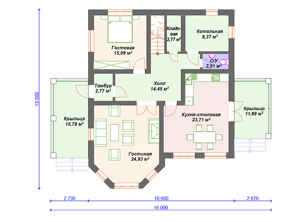 Список вспомогательных помещений включает кладовую у лестницы, котельную и небольшой дневной санузел.