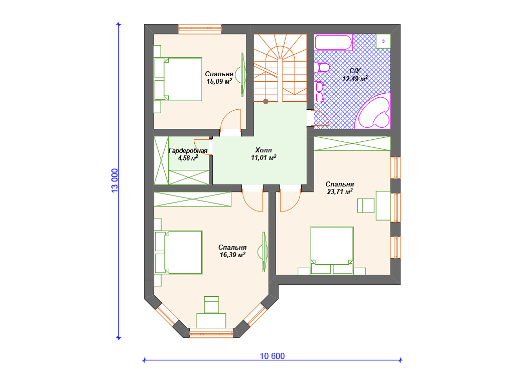 Наверху находятся три спальни больших размеров. Они спланированы вокруг холла, из которого можно попасть либо в общую ванную, либо в гардеробную.